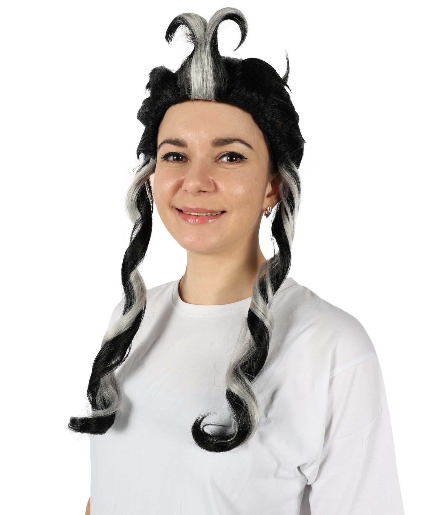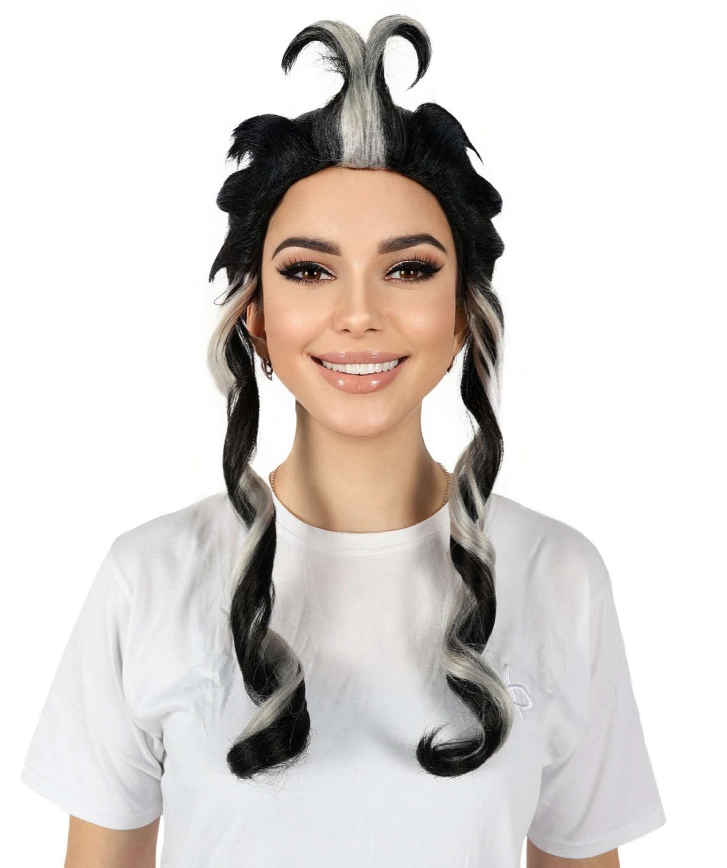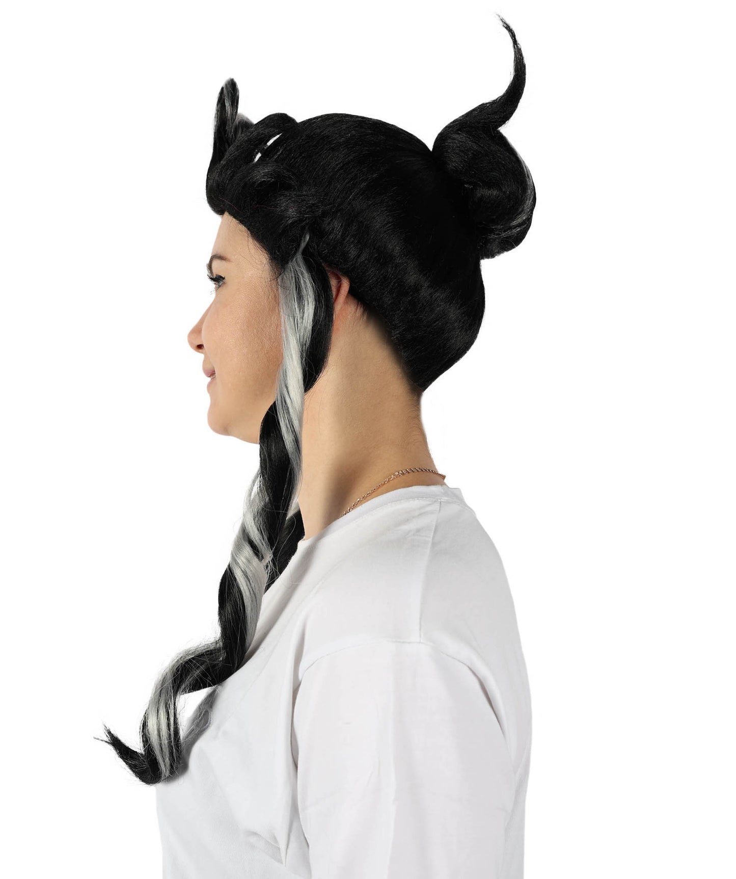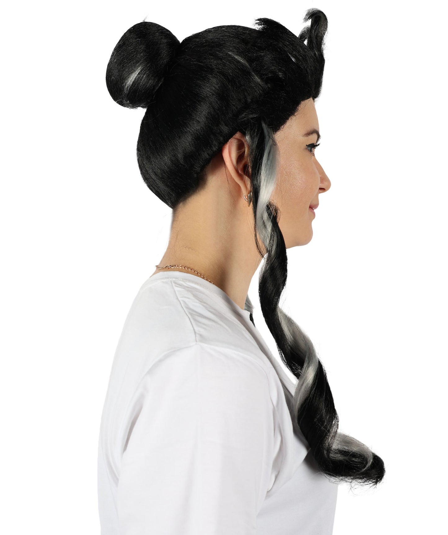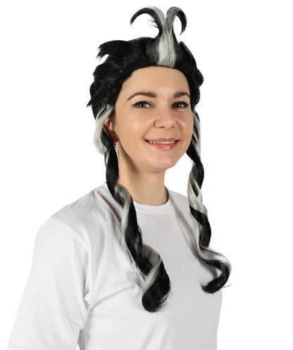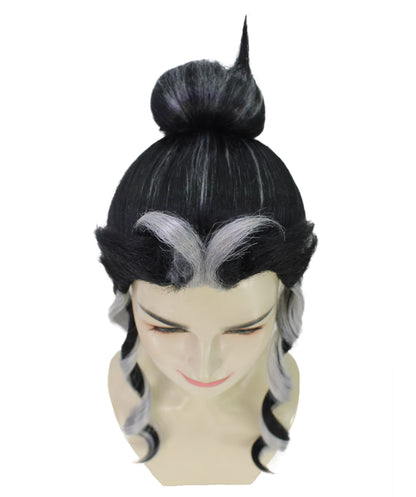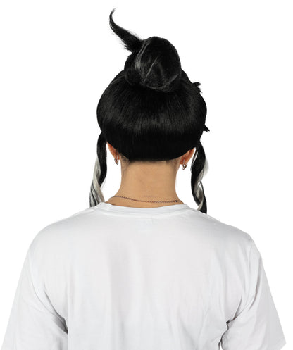 The Japanese Manga Black & White Topknot Bun Wig is suitable for any manga or anime fan to cosplay as their favorite character at any conventions and cosplay occasions like Halloween. This black wig with striking white strands that end in a topknot bun is inspired by characters from a Japanese manga series. This wig has two long curls in the front, which gives the entire appearance a genuine feel.