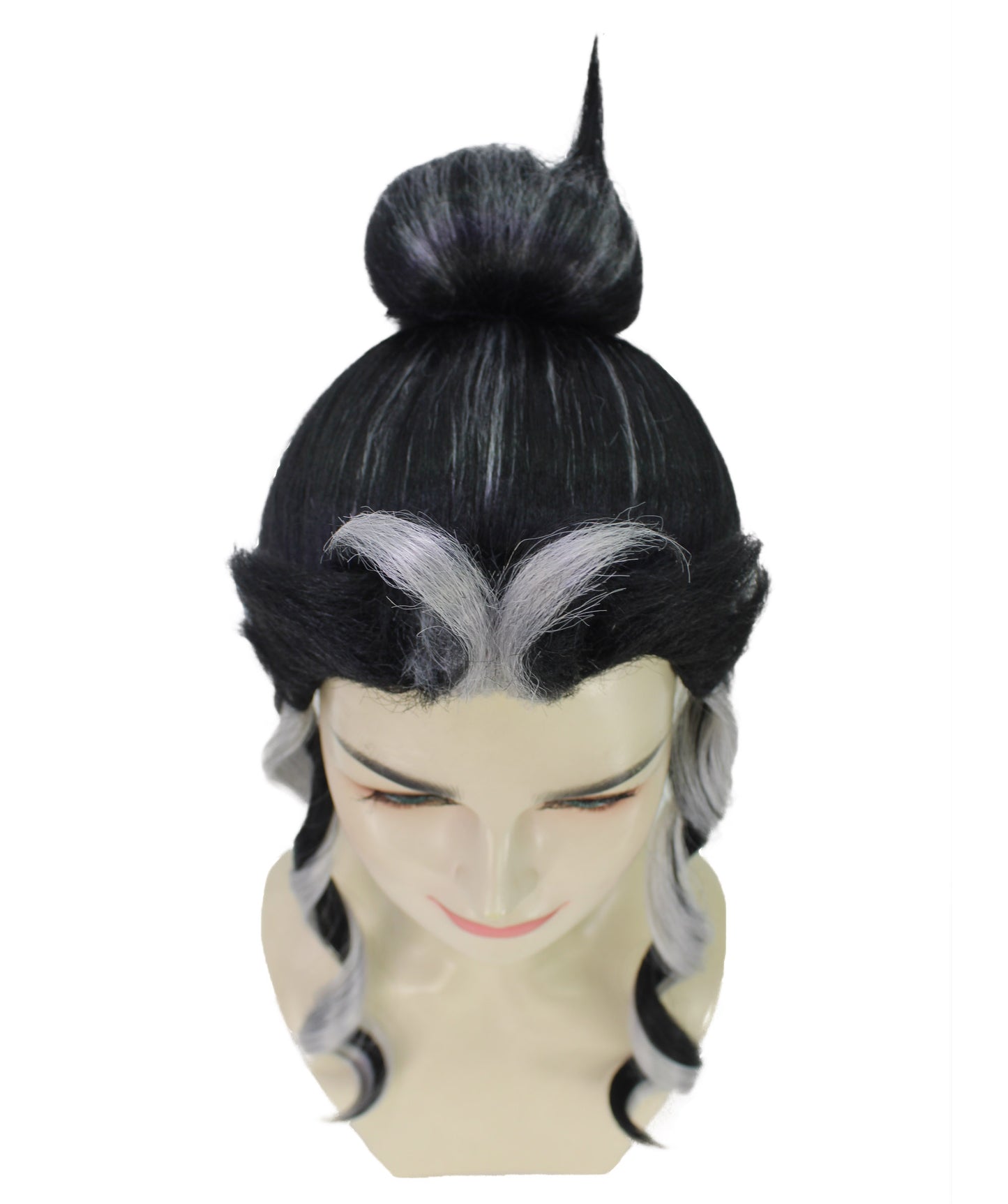 This wig is just the accessory you need to make the character you've seen in the picture come to life in cosplay because of her pointed eyes and gaunt face. This wig will be sure to turn heads at any cosplay gathering, regardless of whether you're a fan of the manga series or are just searching for a unique and striking costume accessory. Wear this Japanese Manga Black & White Topknot Bun Wig with any matching costume and you are good to go for attending Halloween, a cosplay event, or an anime con party!