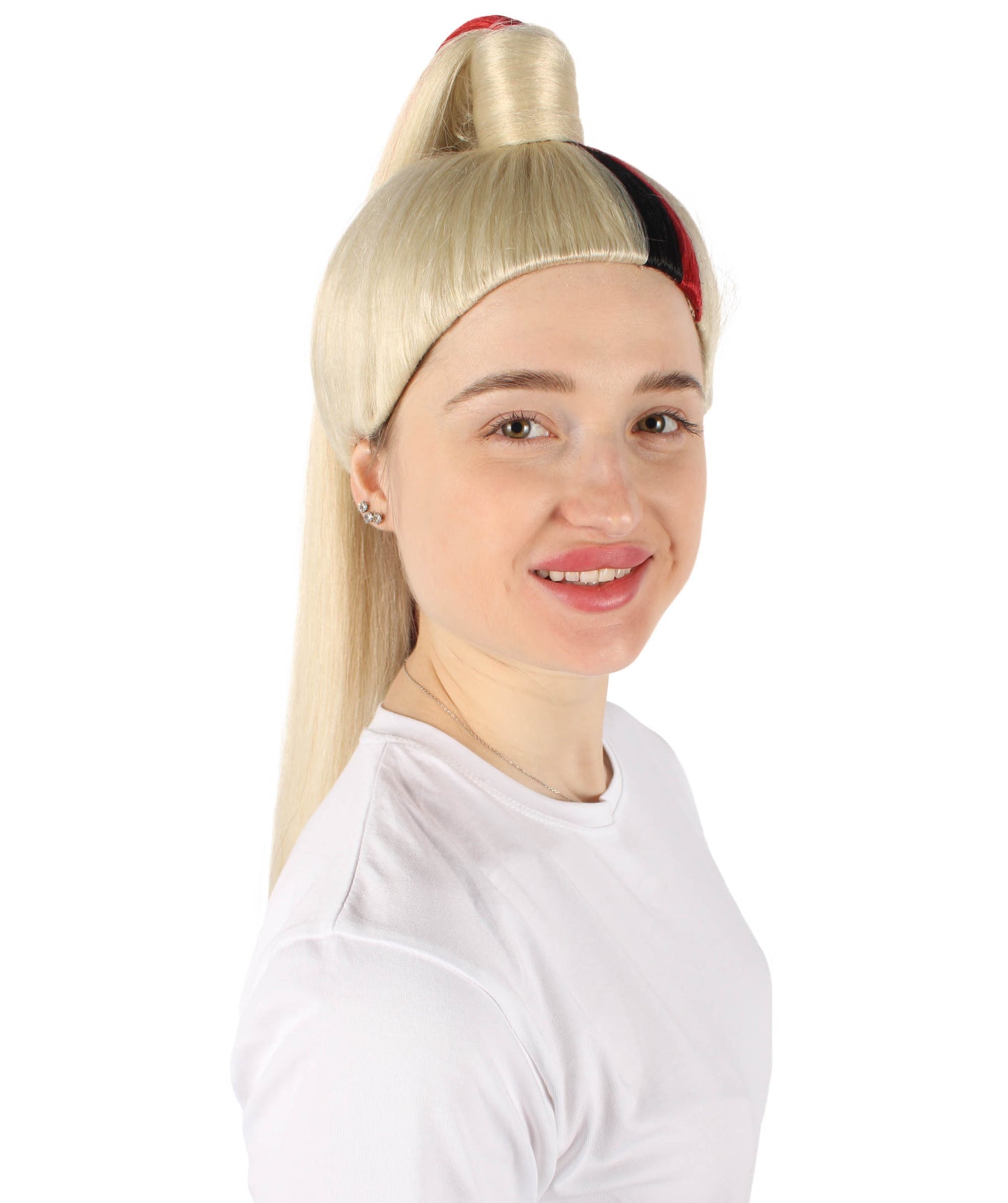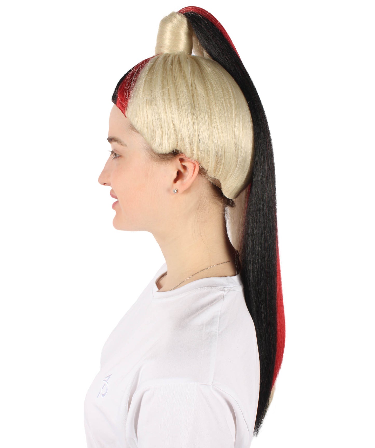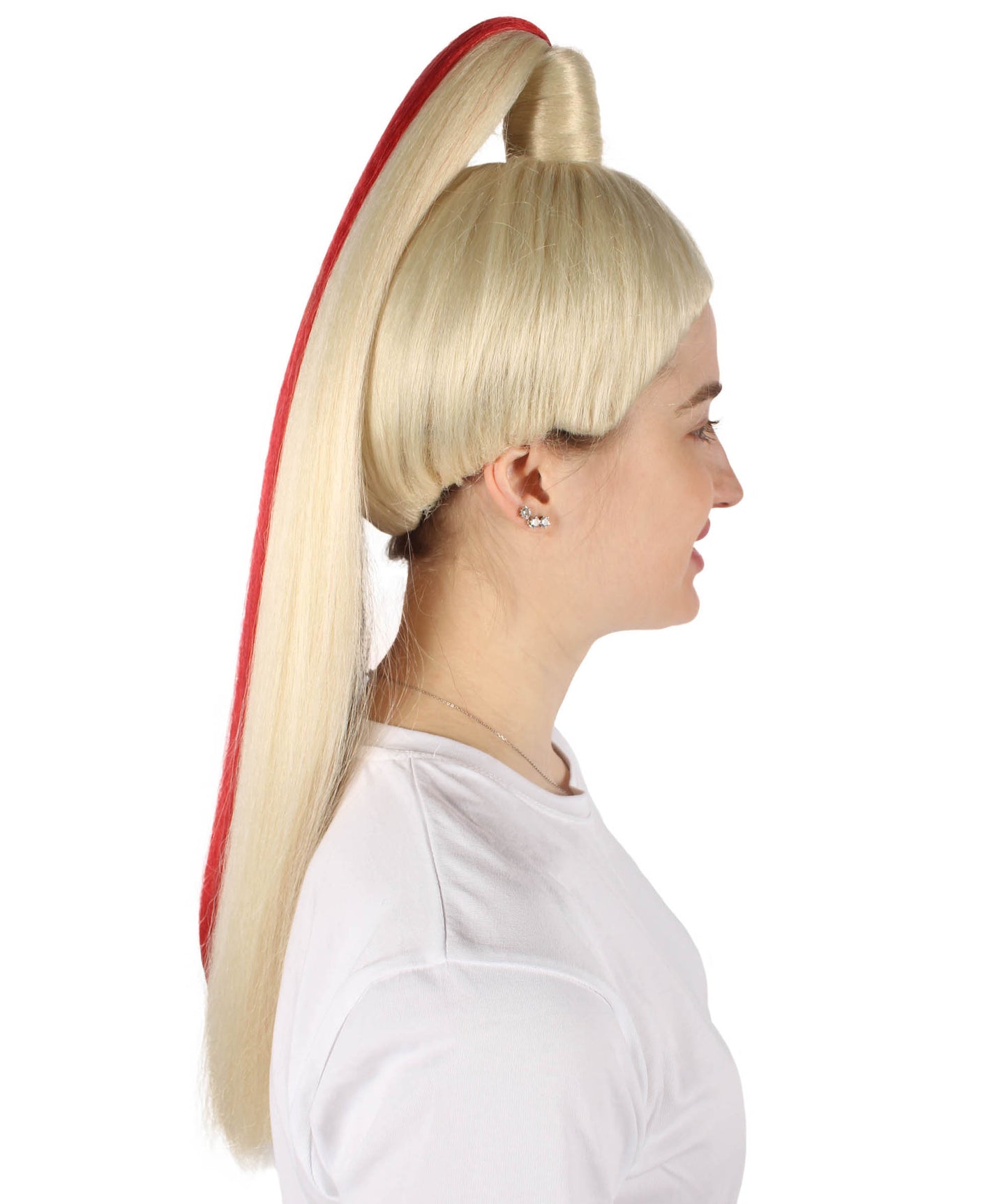 This hairpiece has a playful updo ponytail hairstyle that adds a modern touch and makes it a perfect choice for characters who love to keep fun and fabulous. Whether you're trying to a fiery fantasy character or a sassy and vibrant personality, this wig will change your costume game. Get ready to catch the limelight, make people amazed, and show your creativity with the Red and Blonde Long Two Tone Wig. Who says Halloween can't be both spooky and fabulous?