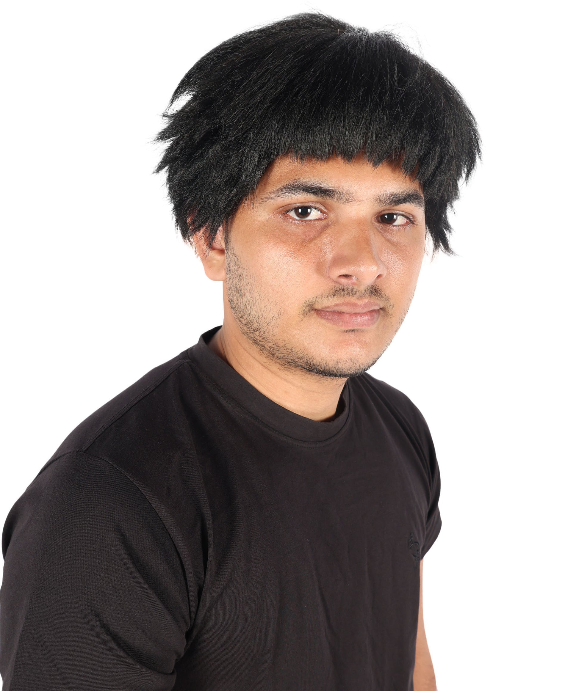HPO Men's Short Black Wig Inspired by Animated Characters | Layered Synthetic Cosplay Hairpiece with Bangs | Halloween, Stage, Roleplay