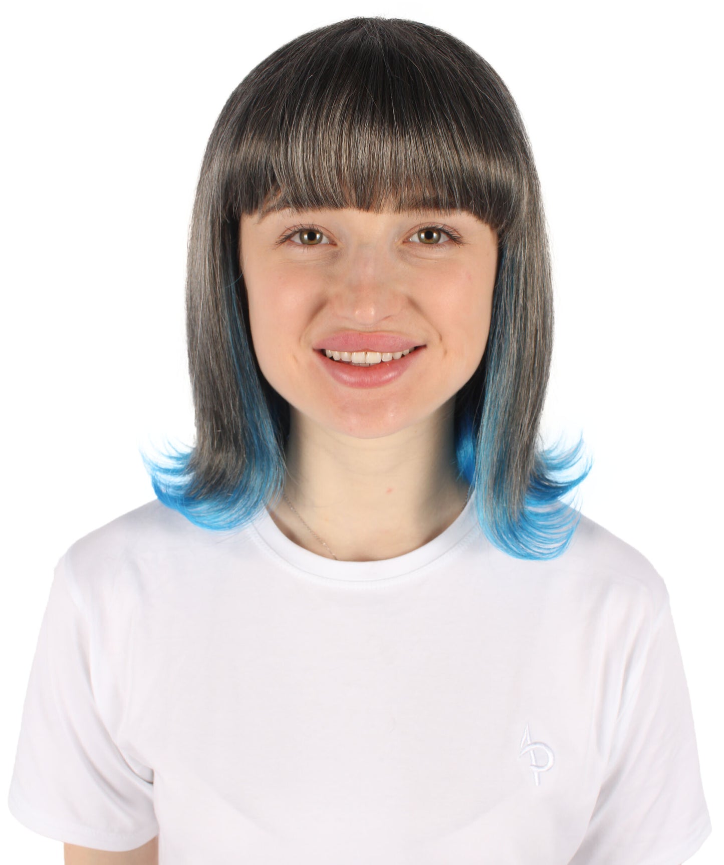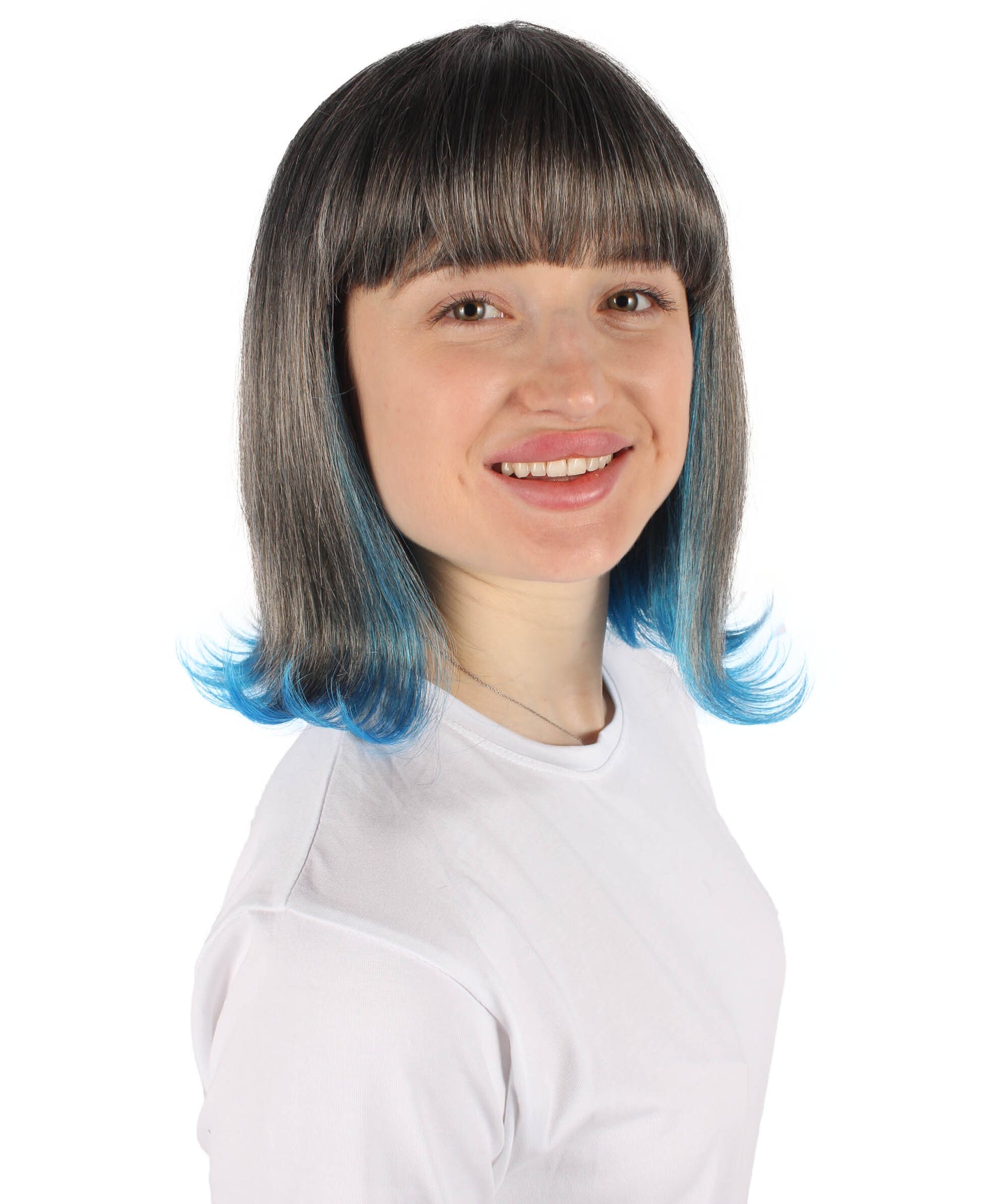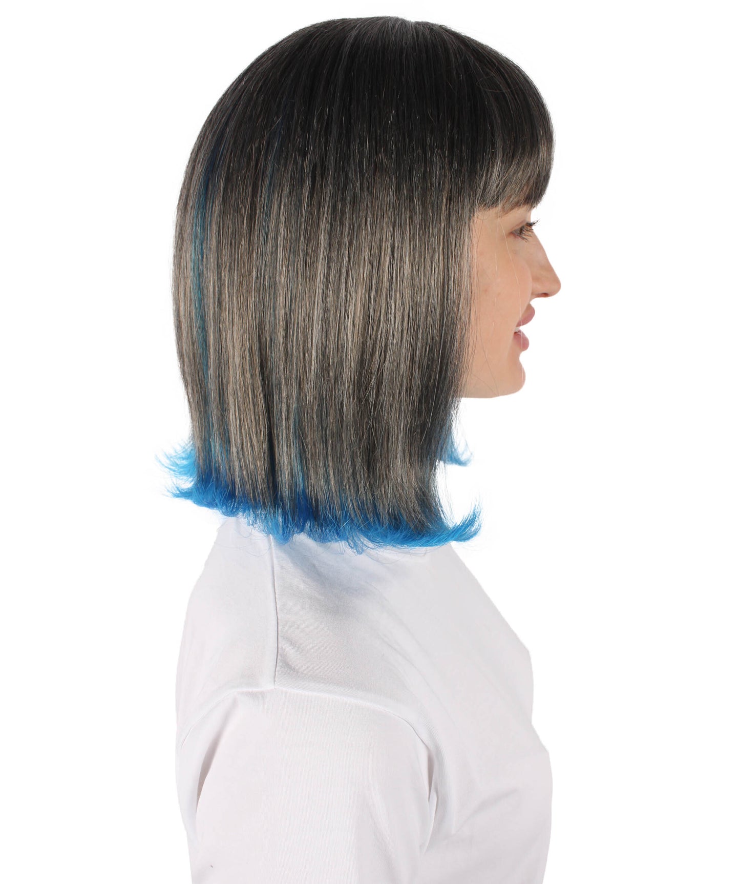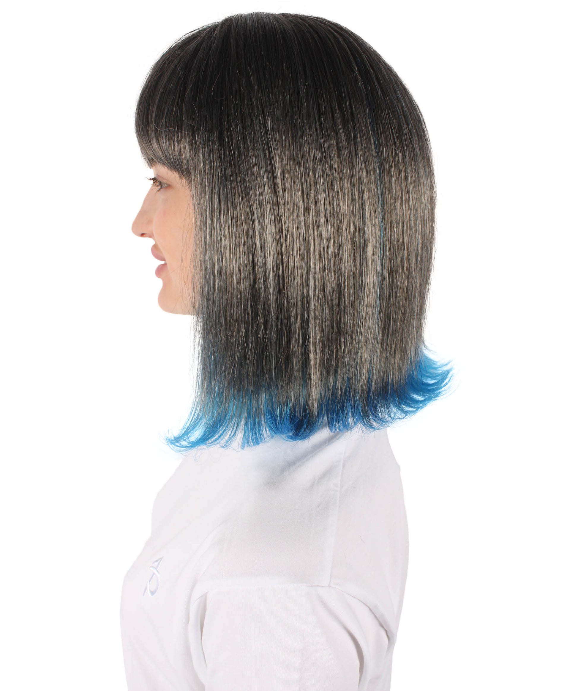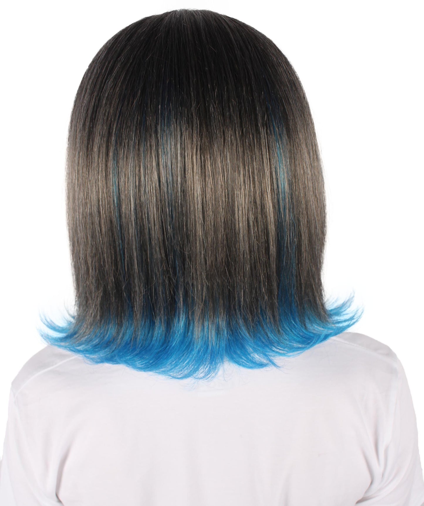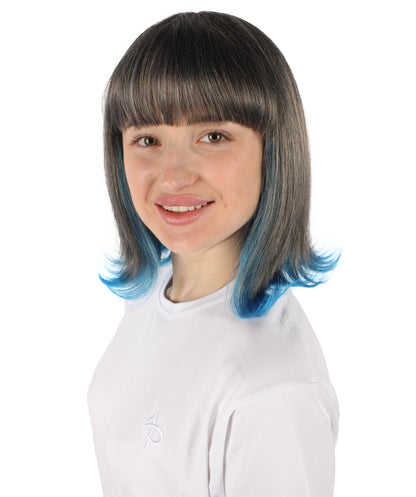 This Short Colorful Bobo Wig will make , Halloween, or gaming party experience even more enjoyable. This wig, which is made of synthetic fiber that is flame-retardant, not only gives your appearance a pop of color but also keeps you safe while you celebrate. The wig's remarkable blue tint at the ends displays its black base to create a dramatic and visually striking effect.
