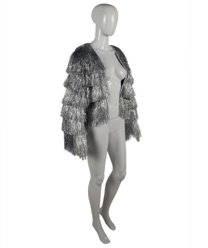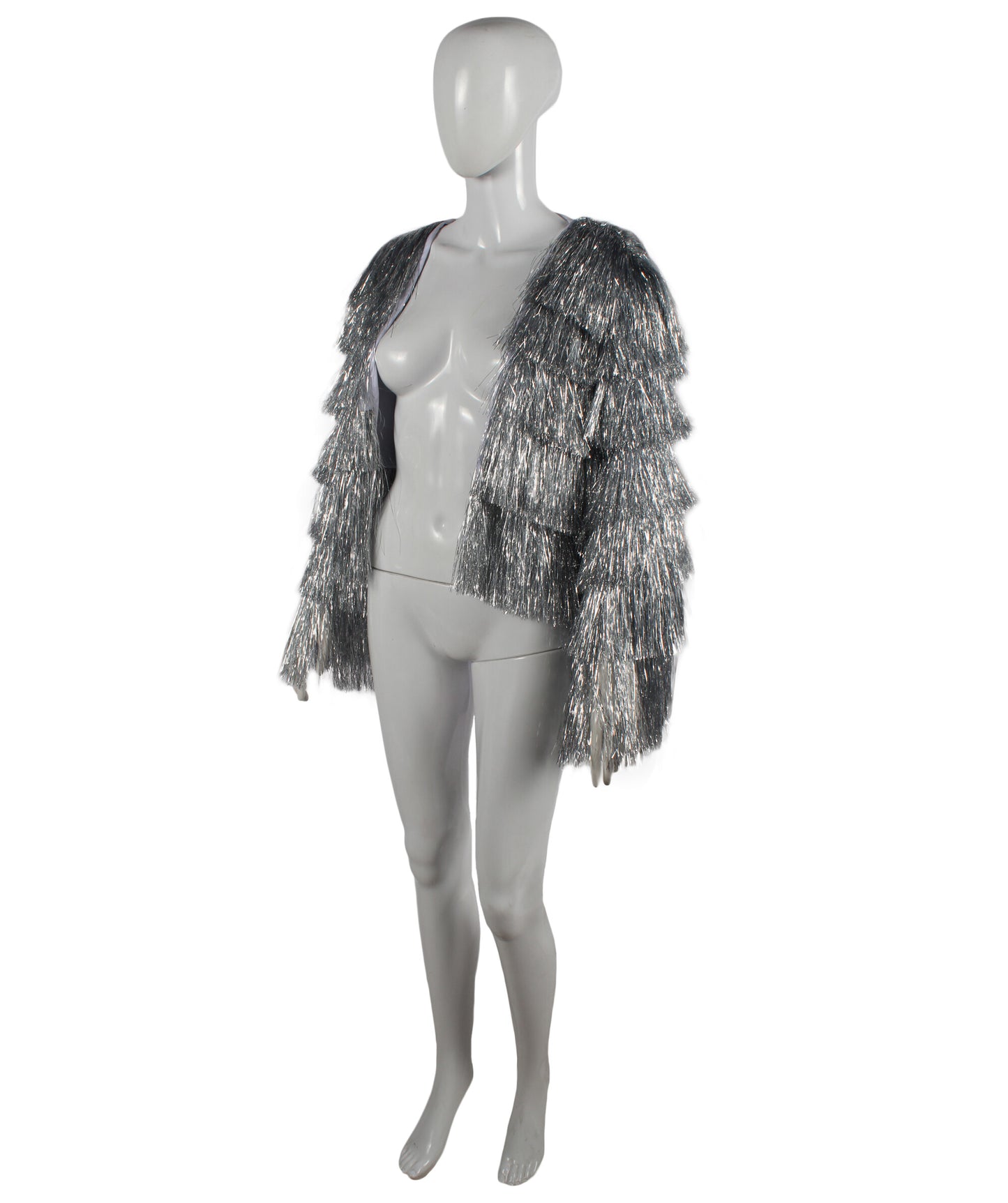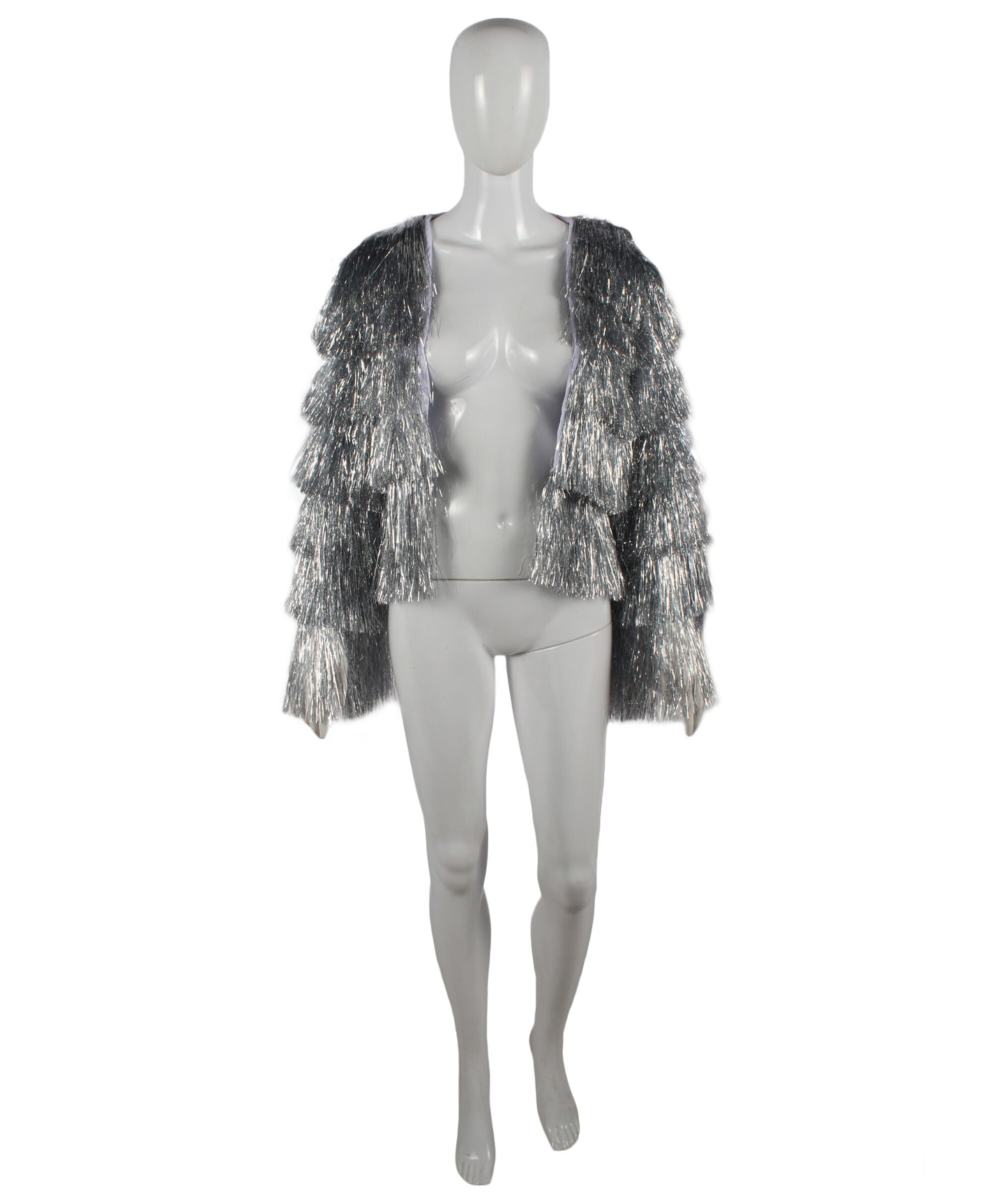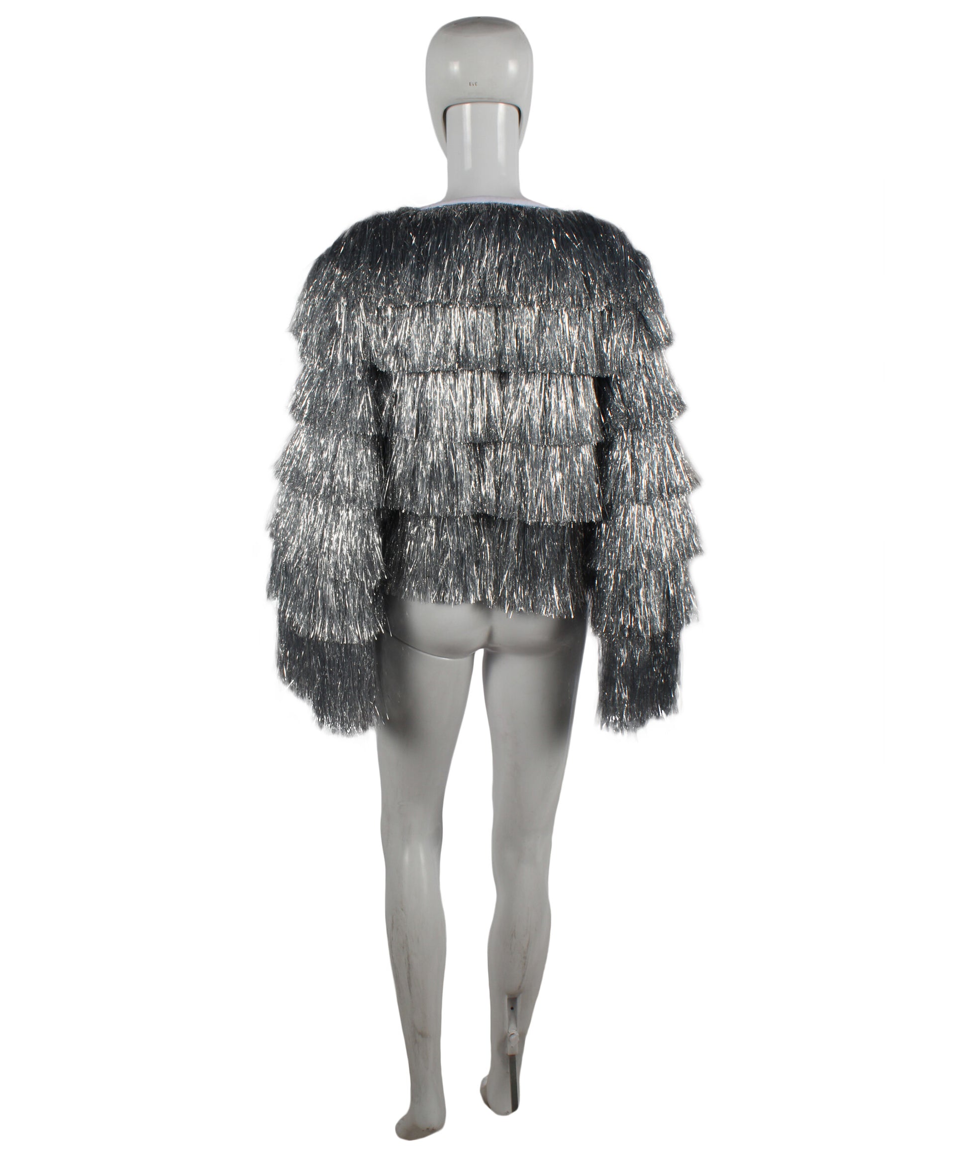 Just a friendly reminder: handle the jacket with care to maintain its original condition. The tinsels are delicate even though they offer a charming shine. Refresh your outfit with this highlight, and make the Sparkly Silver Jacket your first choice for a stunning, attractive appearance at your upcoming party.
