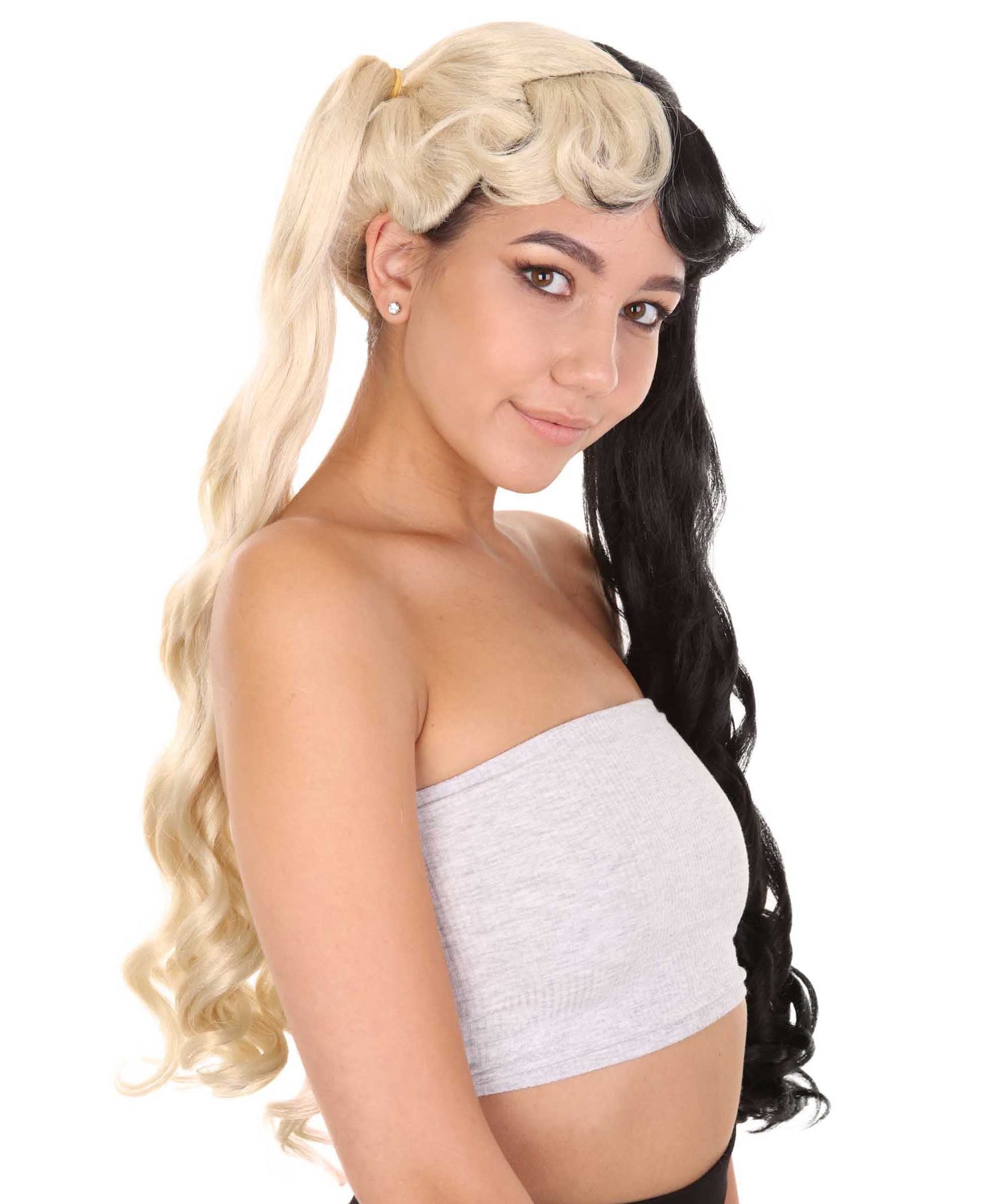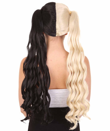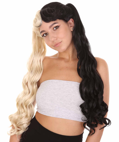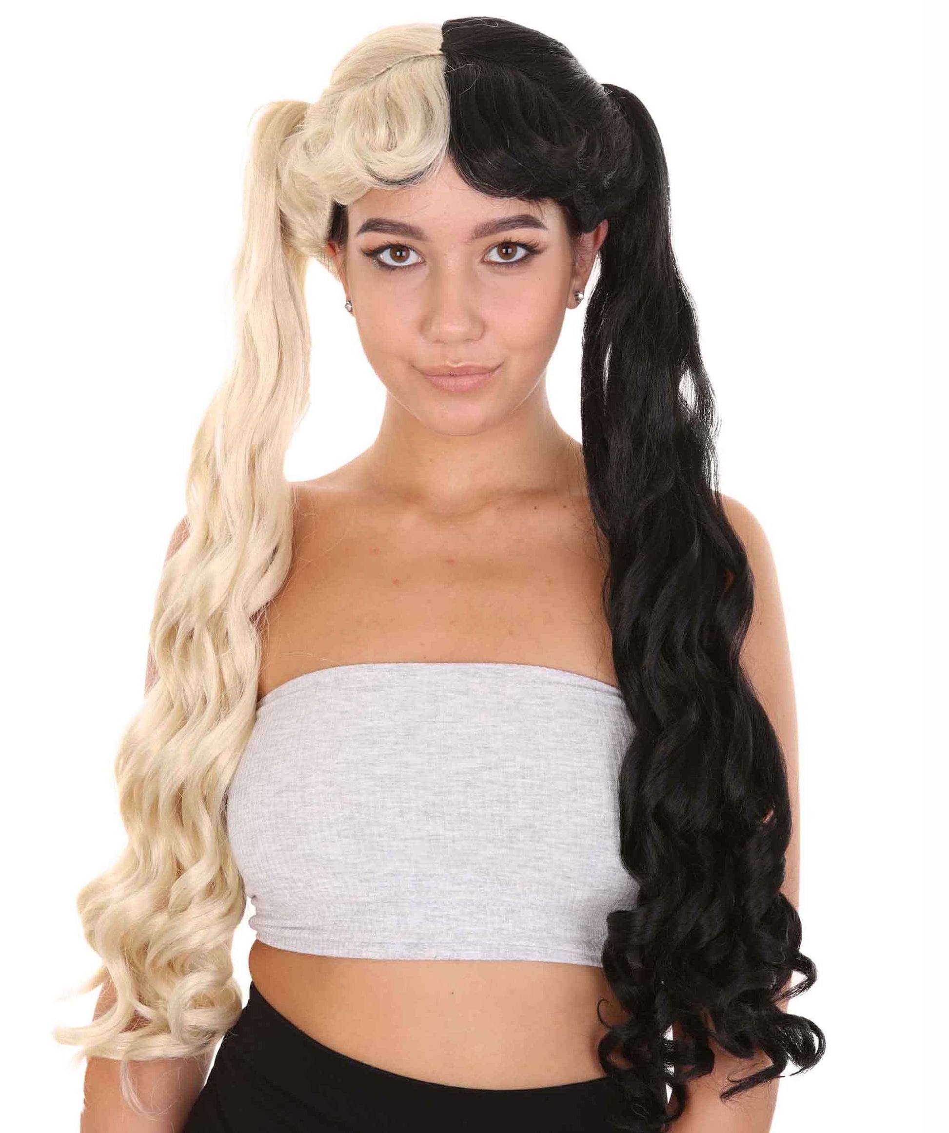 Marie, Long Wavy Two Tone Black and White High Pigtails Womens Wig | Premium Breathable Capless Cap