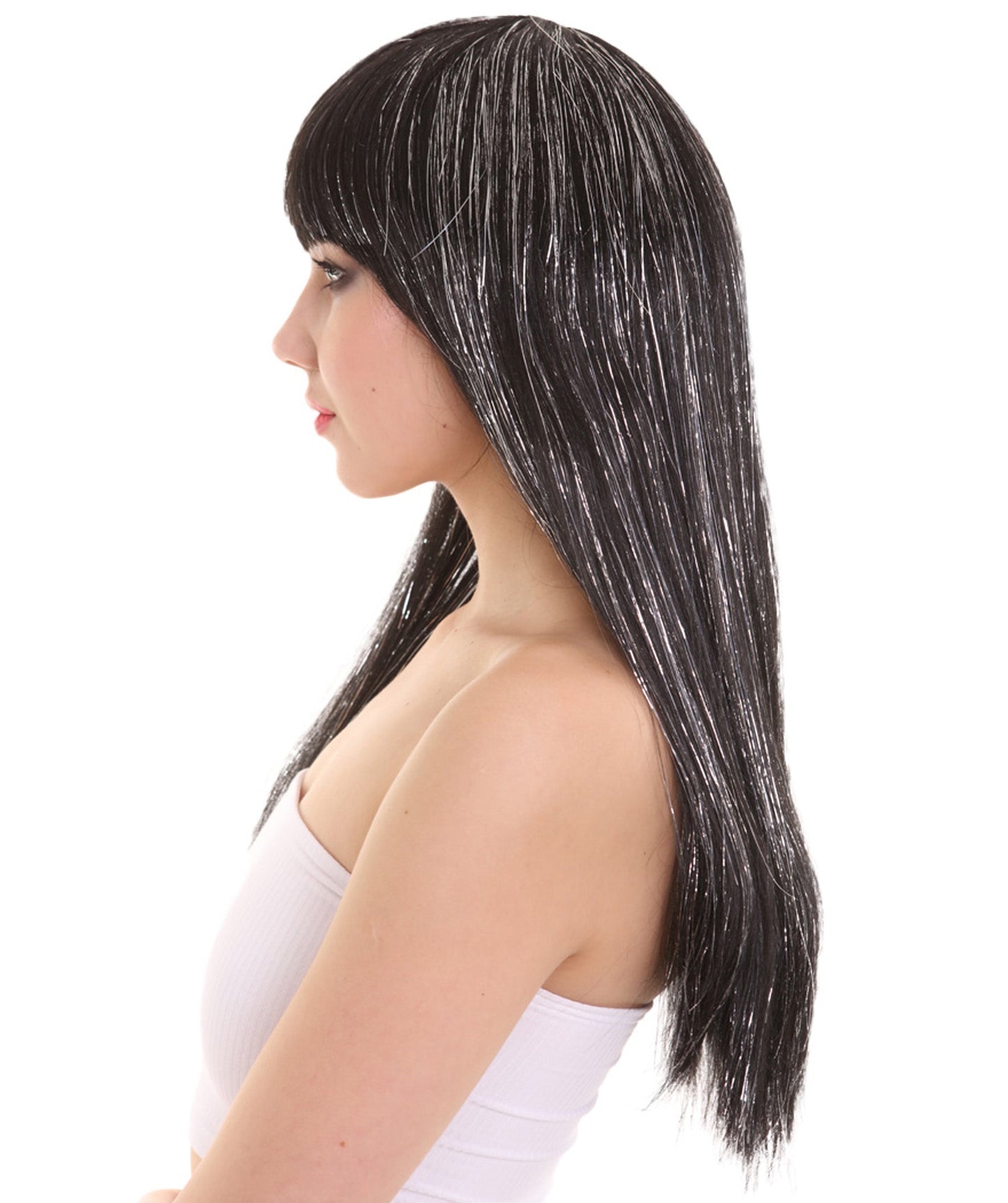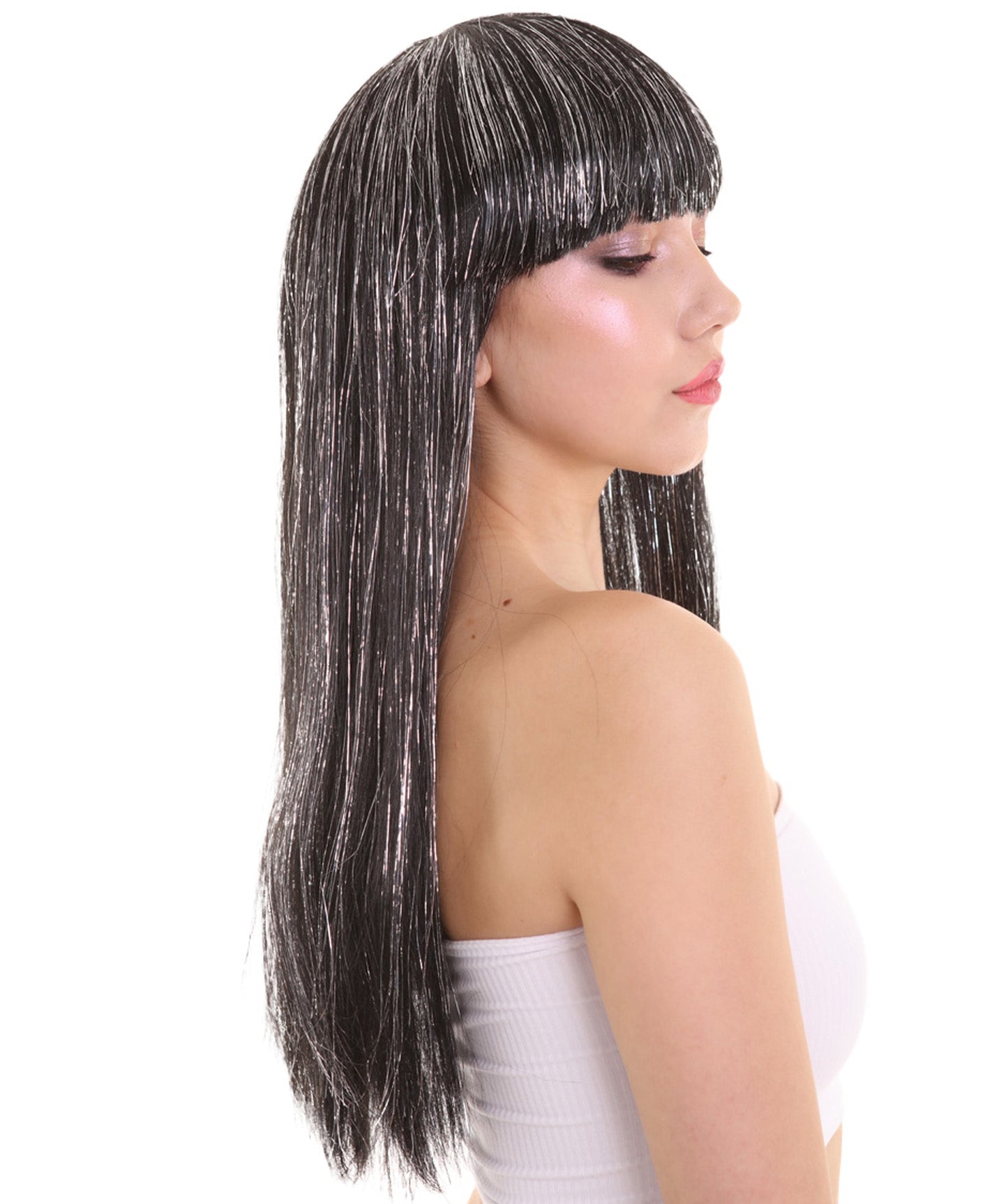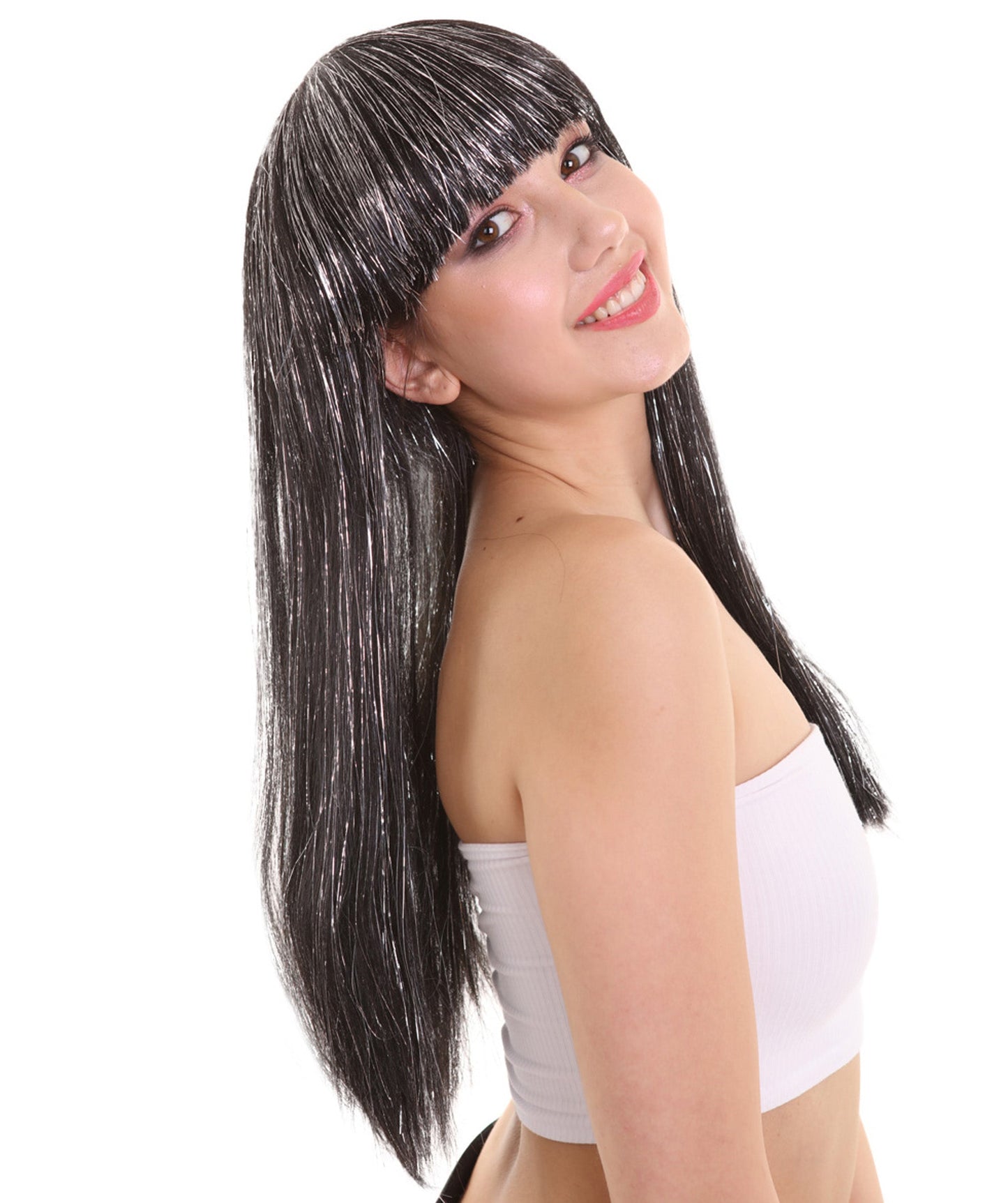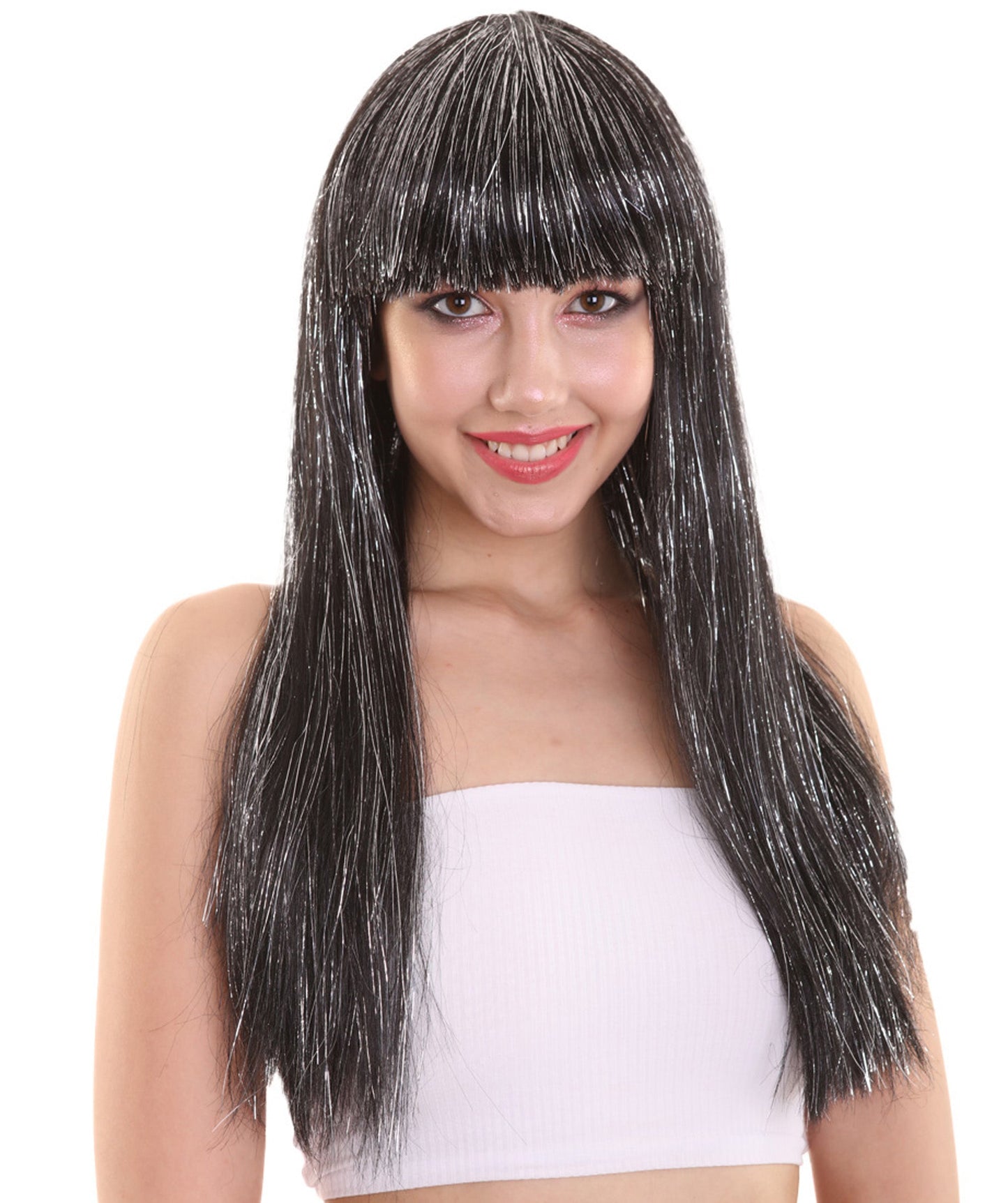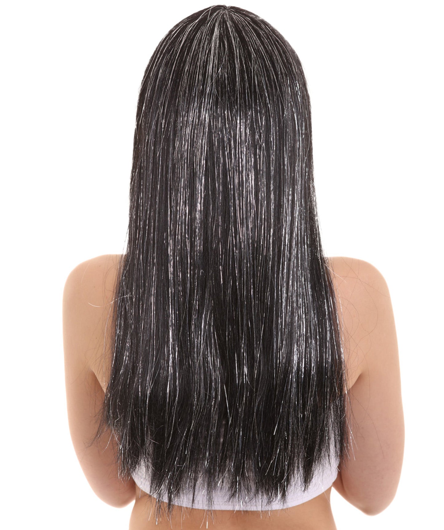 Womens Long Baby Black Wig with Tinsel Highlights | Halloween Rave Wig | Premium Breathable Capless Cap