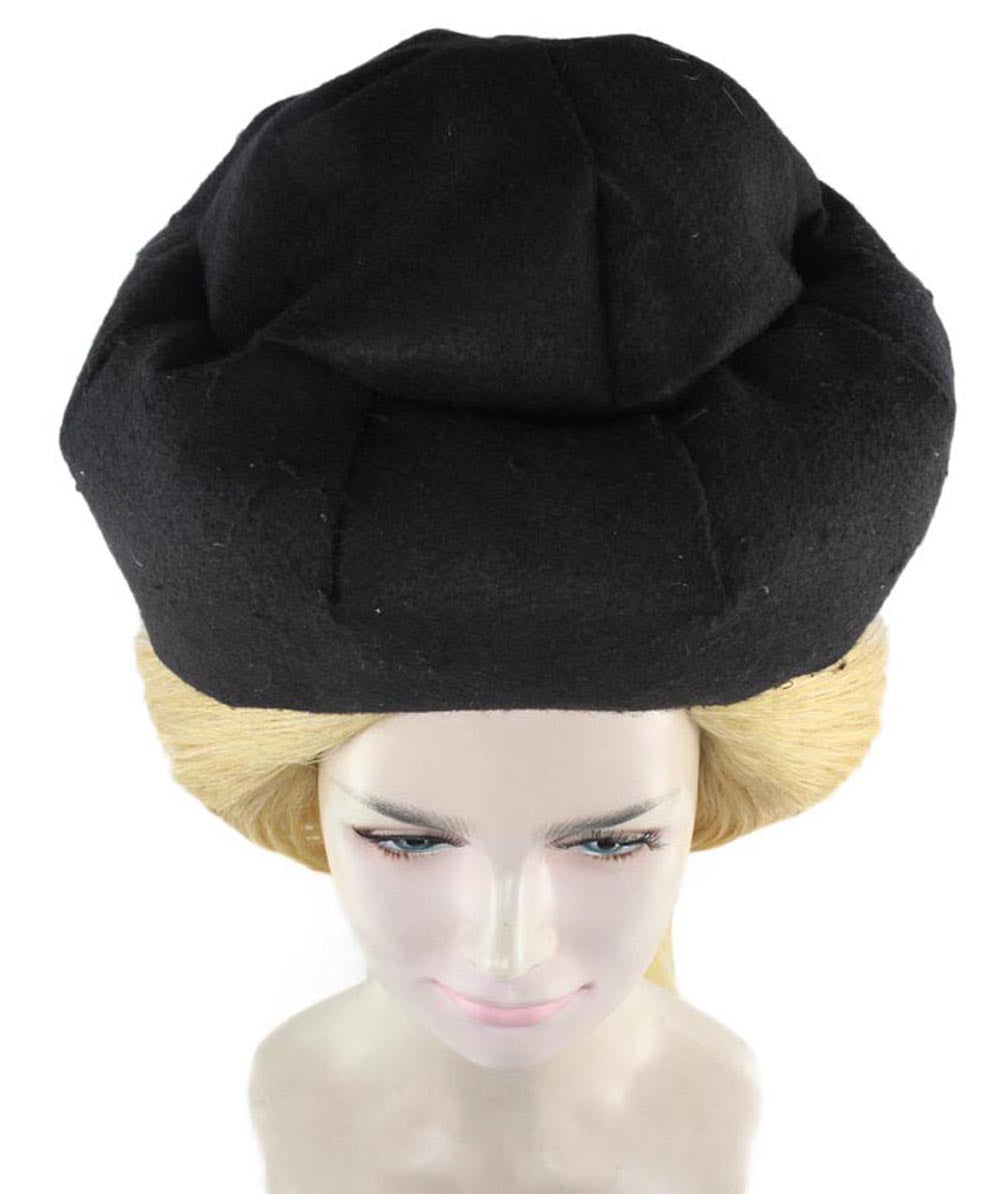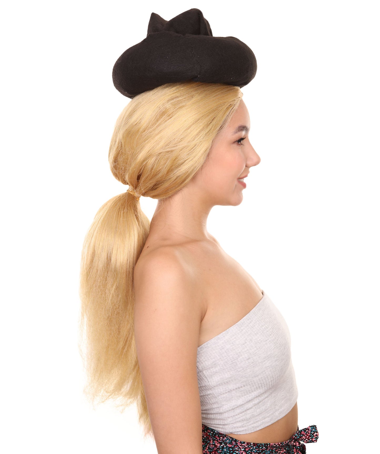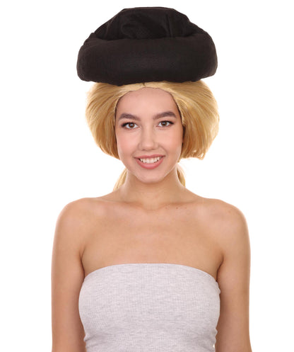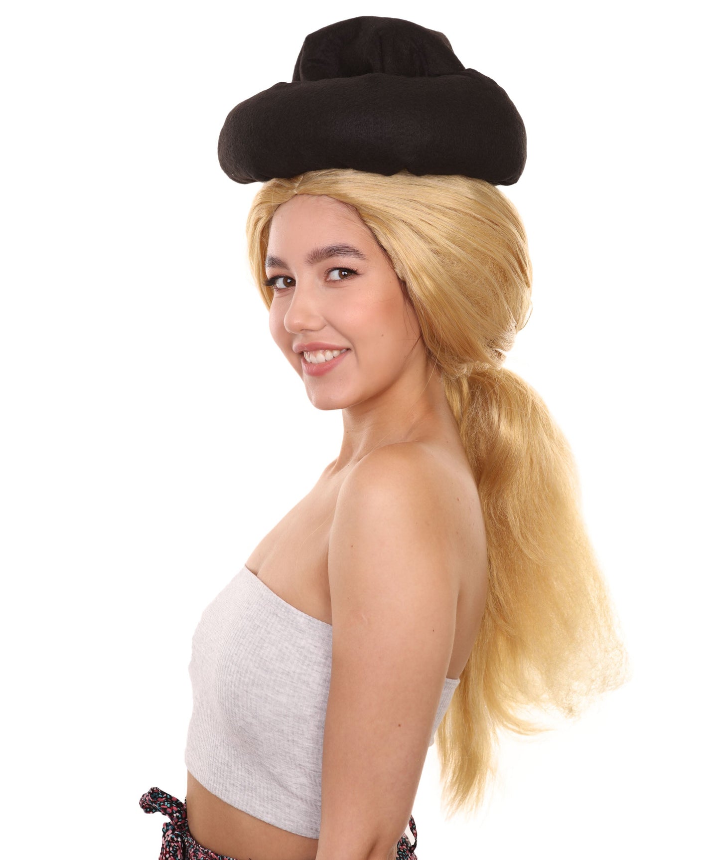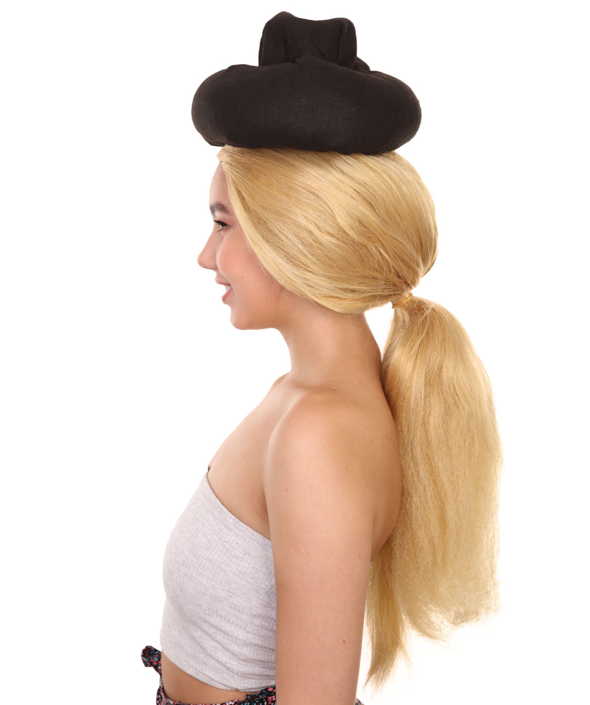 Man Goona Hat Wig is designed to mimic a character from a popular animated movie. The character displayed a young woman from the Bronze Age who was skilled at playing football. She was depicted as having long, wavy hair tied back in a ponytail with a small braid on the side. She wears a black hat on top of her head. The wig covers the top of her head and falls down her back in long, straight strands.