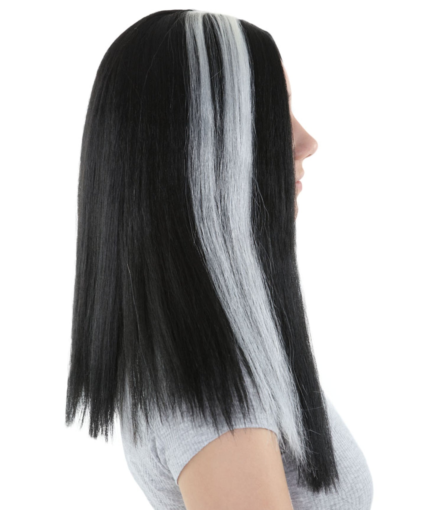 The Women's Vampire Wig from HPO is the perfect addition to your Halloween, Fancy, or theme party costume. This medium-length wig is designed for women who want to get a spooky and authentic look. The black and white color of the wig adds a realistic touch to your vampire costume, while the thick hair strands add volume to your hairstyle.