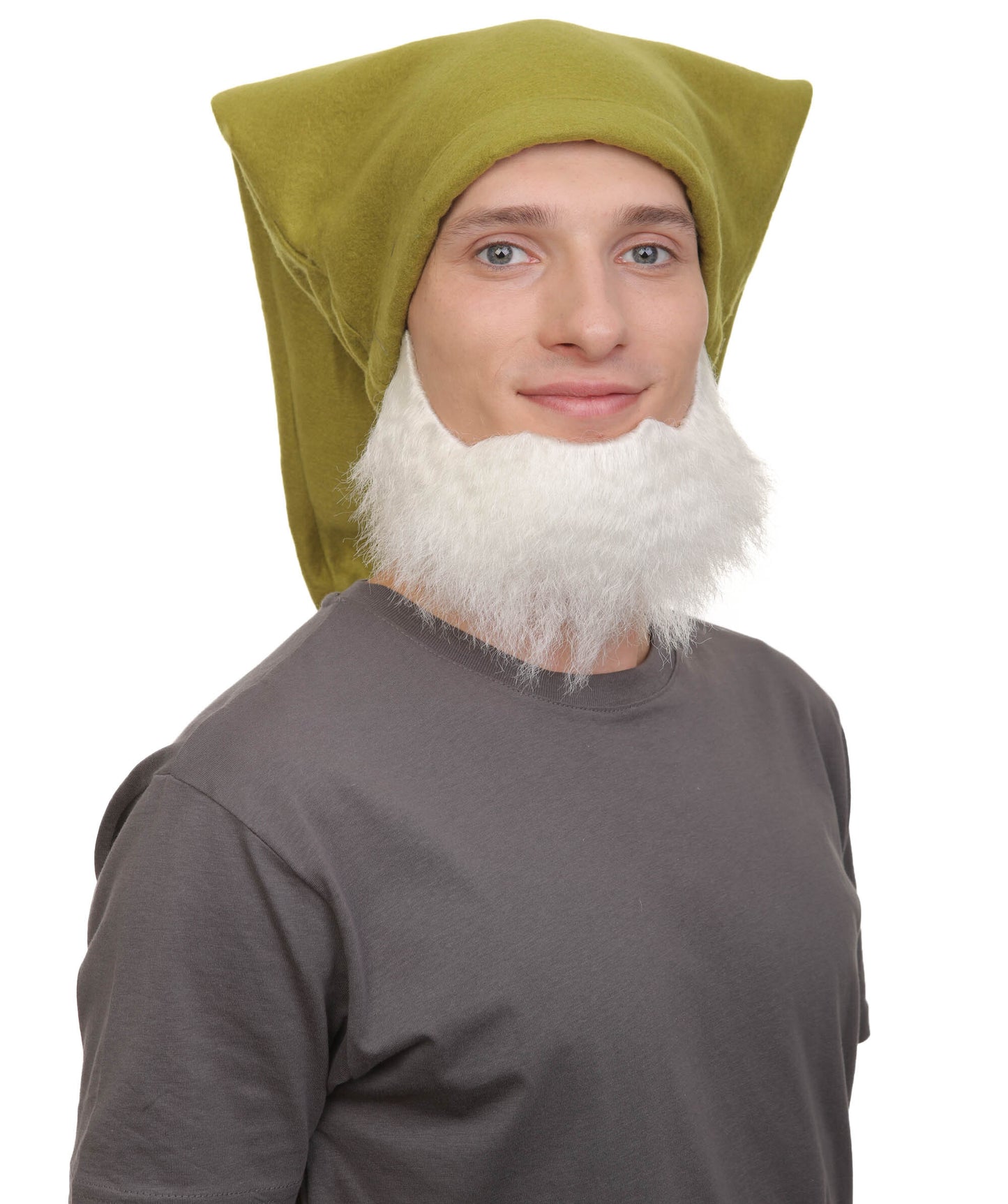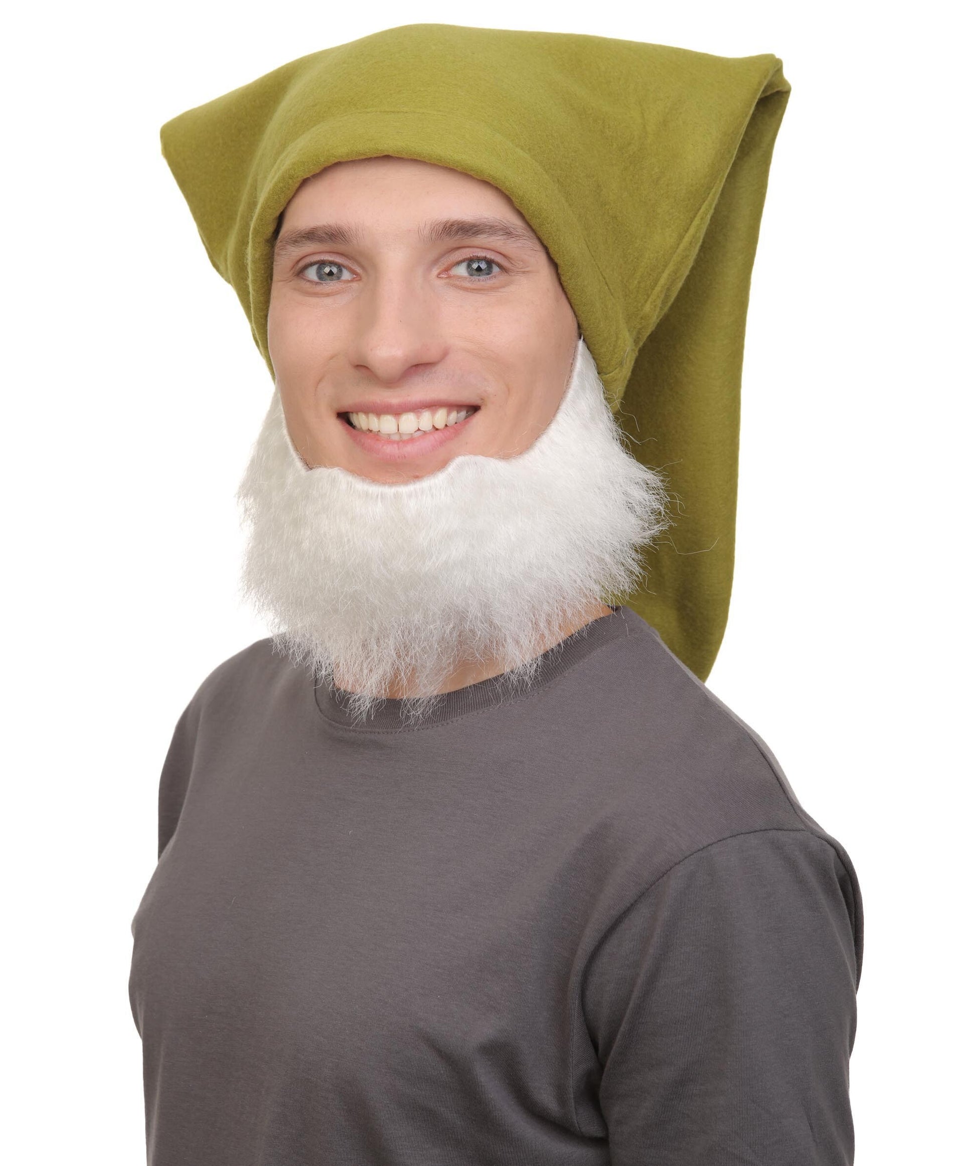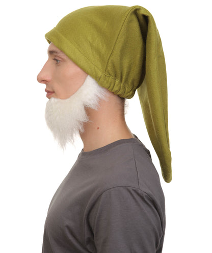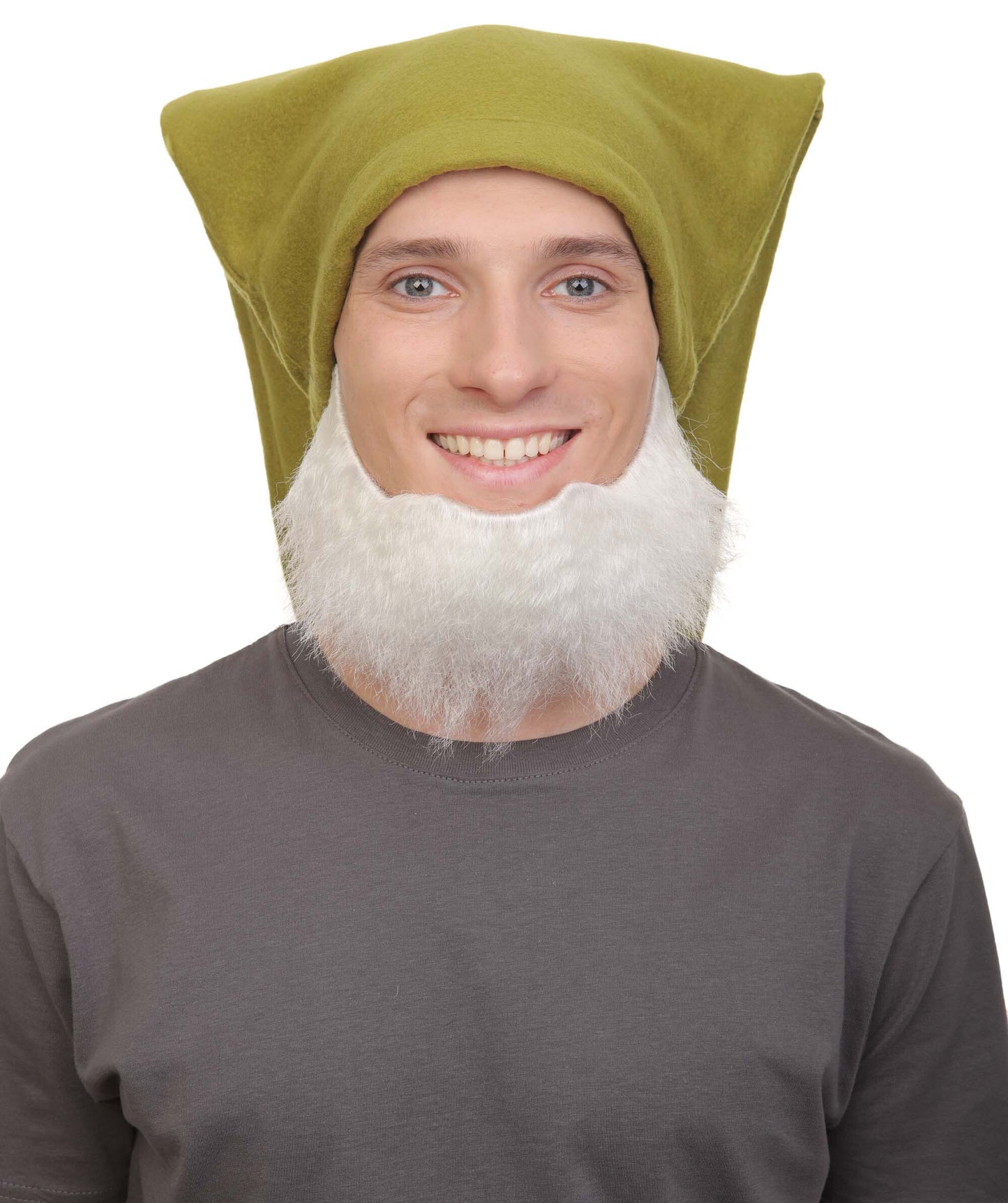 Men’s Classic Animated Snowy White Dwarf Cartoon Beard with Olive Hat l Flame-retardant Synthetic Fiber