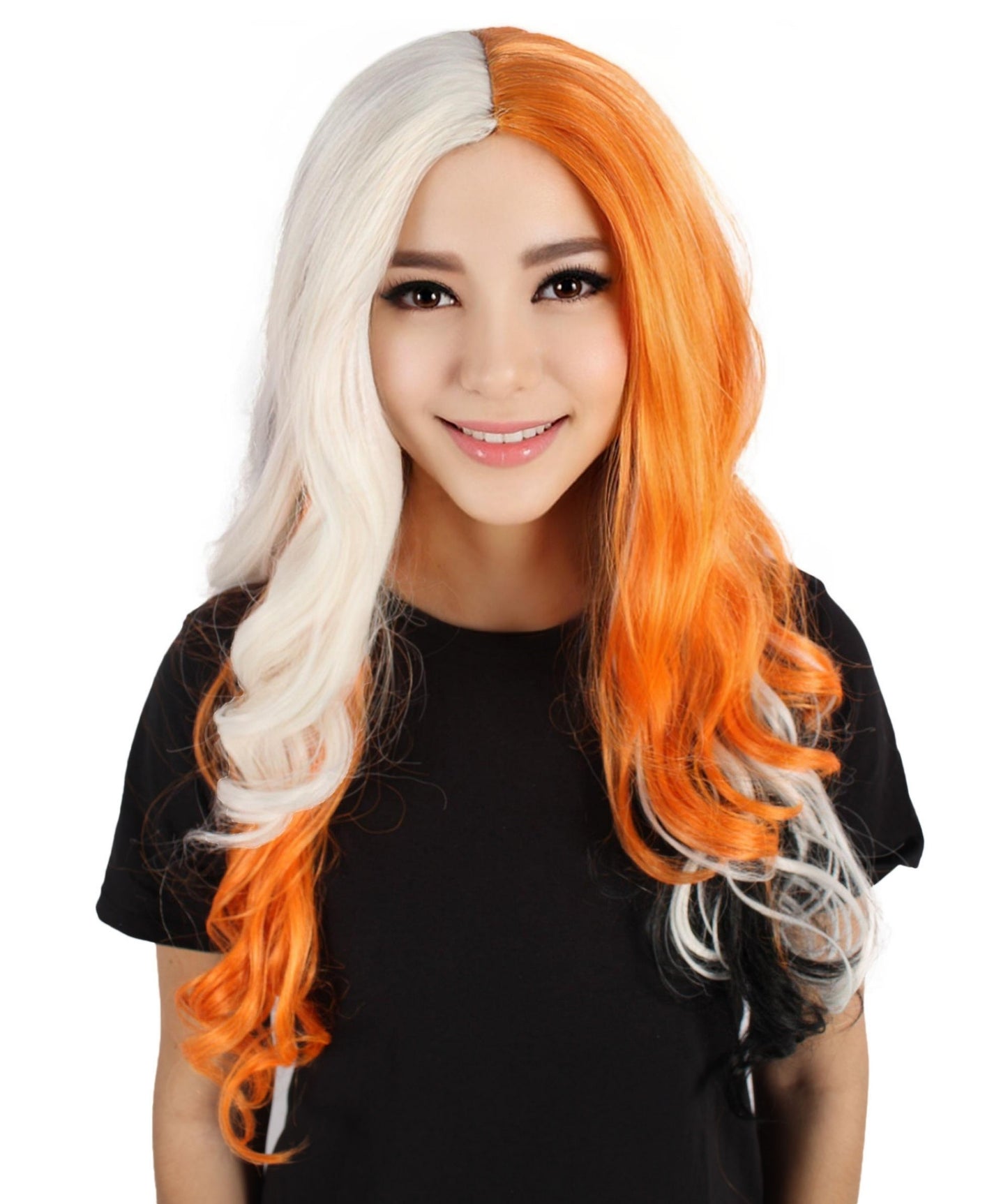 Picture this: you, rocking a cascade of wavy goodness in shades of white, orange, and black. It's like a hair party on your head! This wig isn't just an accessory; it's a statement, a vibe, a whole mood.