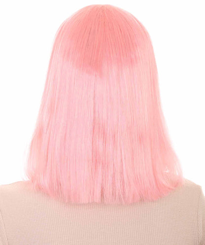Made of flame-retardant Synthetic Fiber, this Pink bob-styled cosplay wig with bangs comes with an adjustable lining that can be stretched up to 22 inches in diameter making it perfect for both adults and children up to 5.