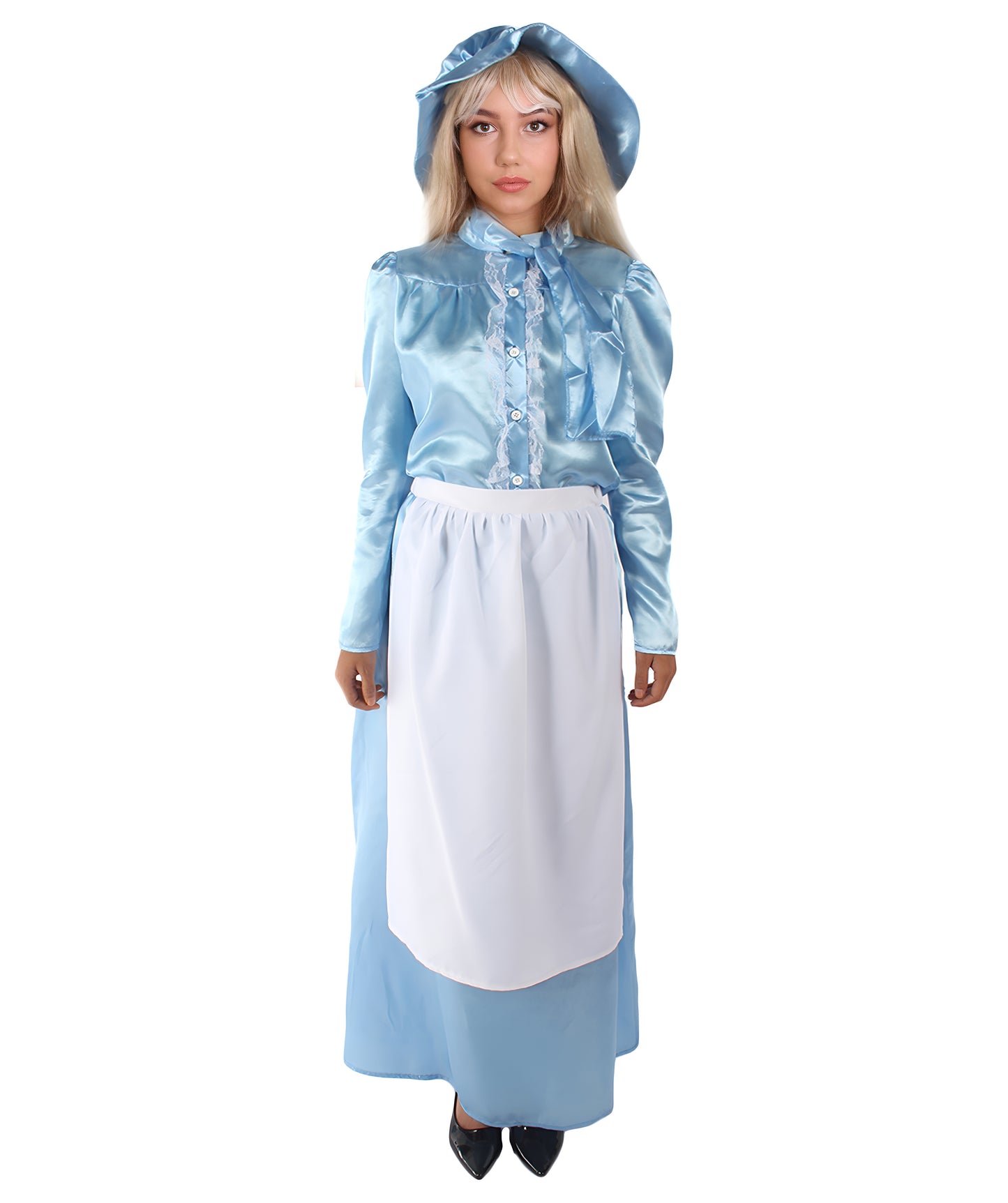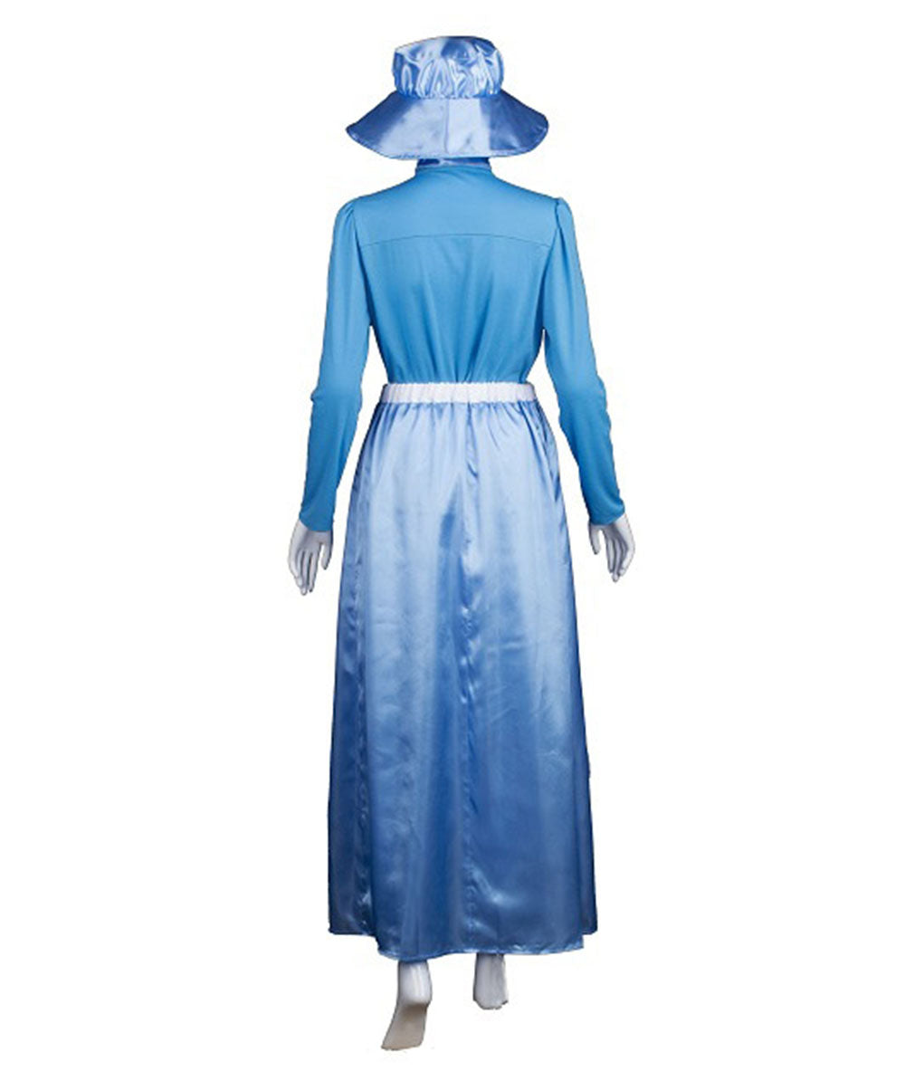 The costume features a long-sleeved, blue dress with a modest and vintage-inspired design, a charming matching bonnet, and a coordinating blue scarf.