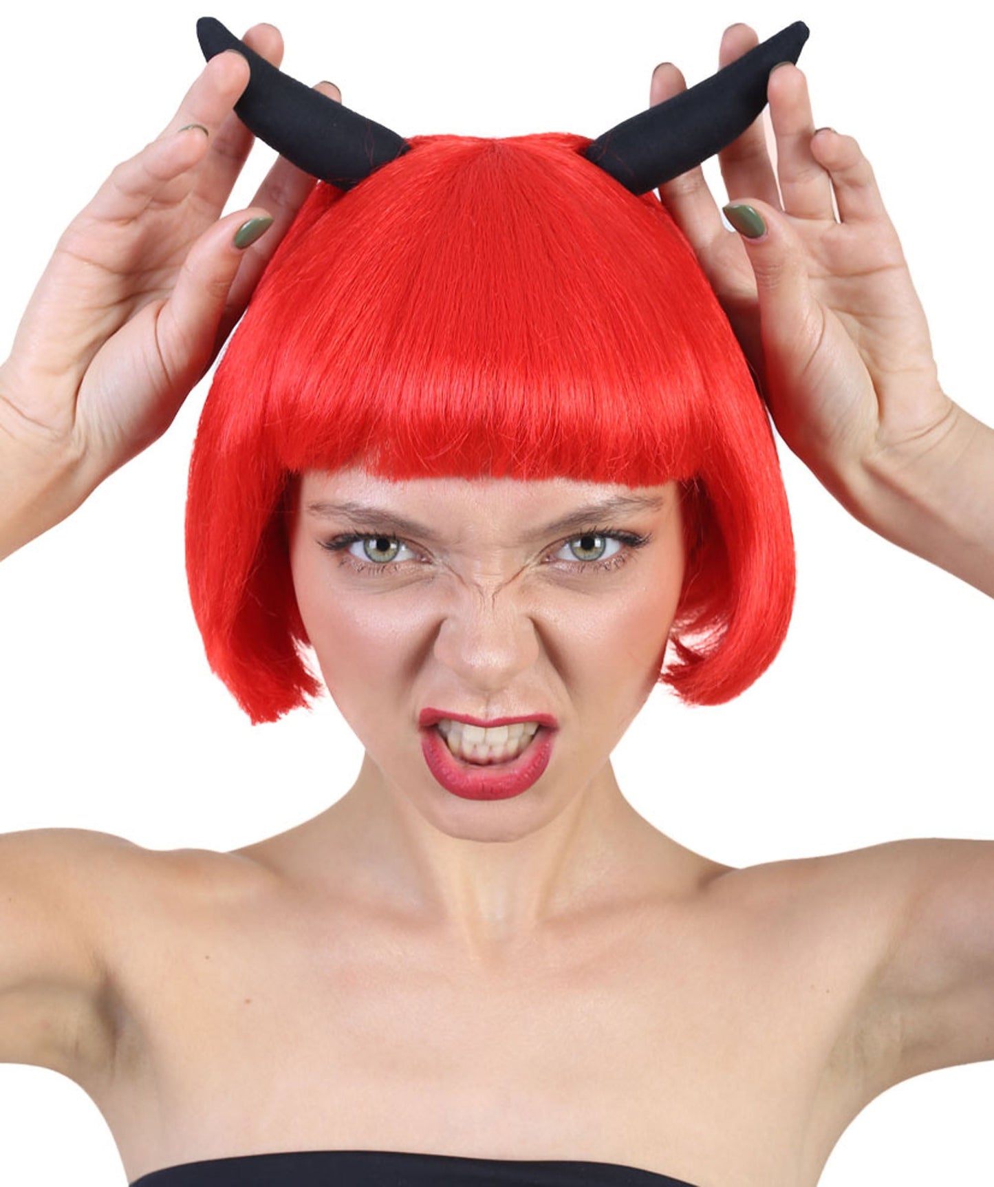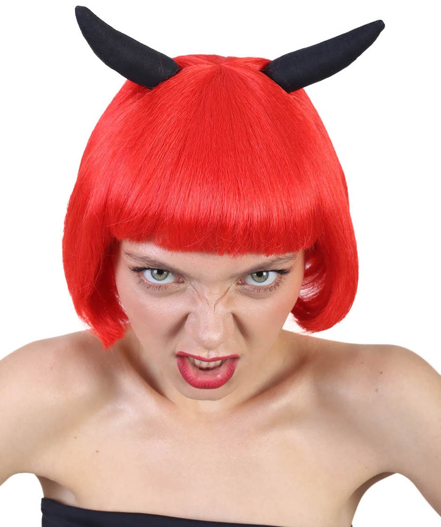 Red Devil Women's Wig with Horns | Horror Character Halloween Wigs | Premium Breathable Capless Cap