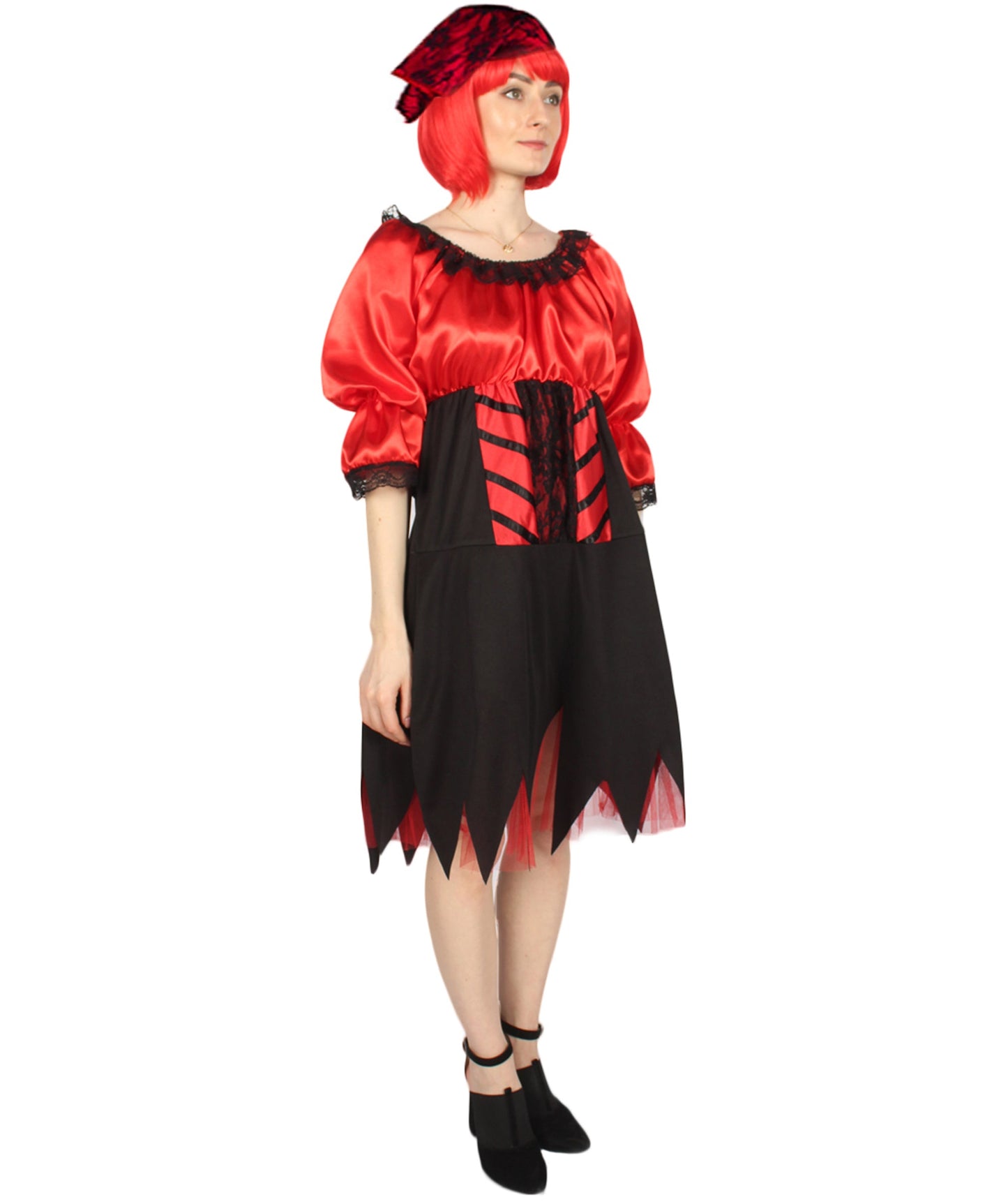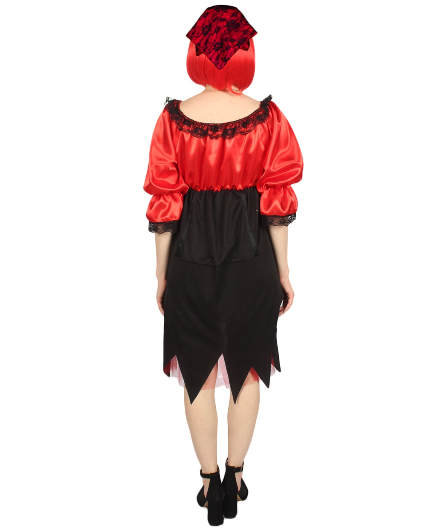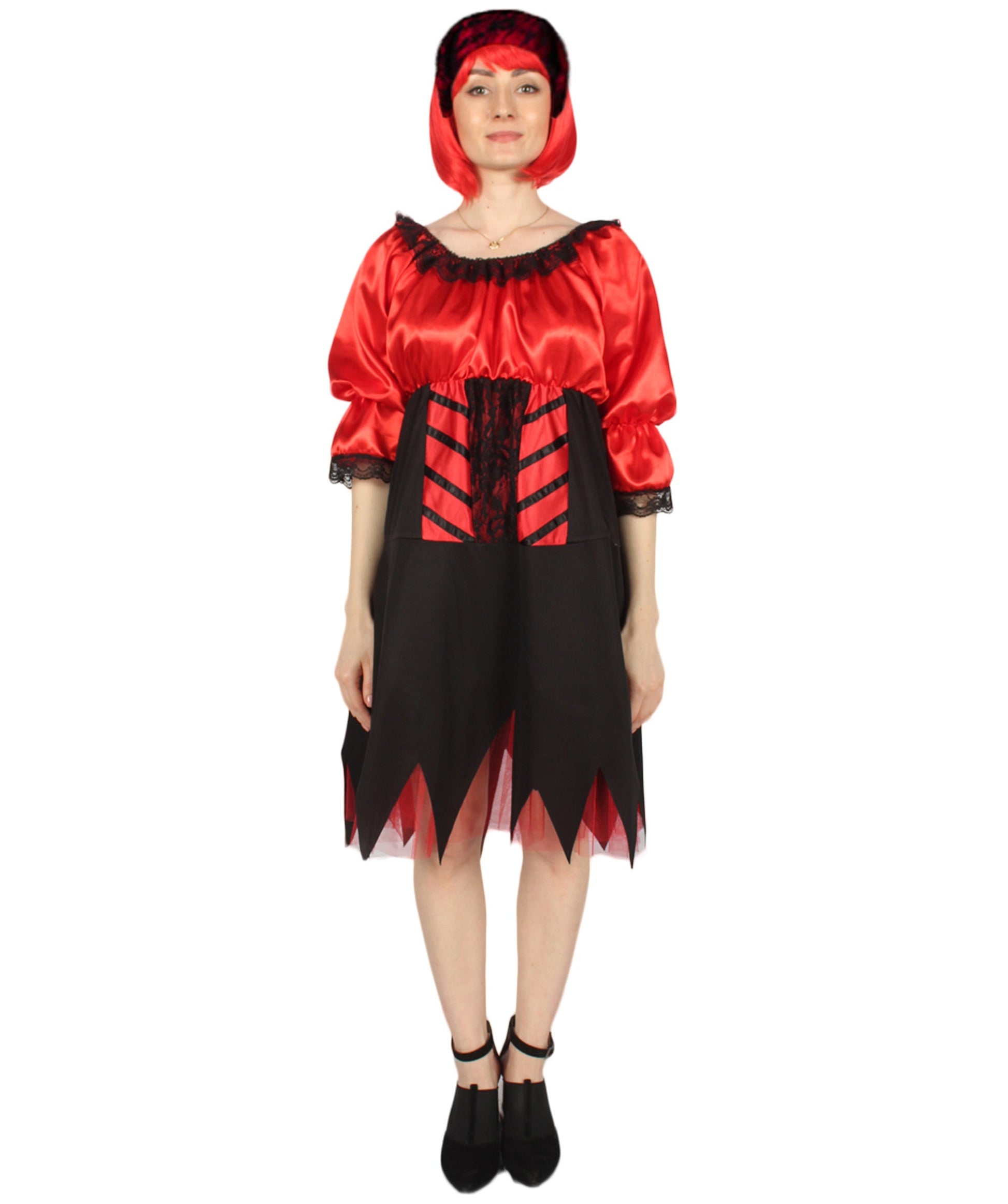 The centerpiece of this costume is the alluring red dress, designed to ignite passions and steal hearts. The form-fitting design accentuates your curves, while the fiery red color adds a bold and daring touch.