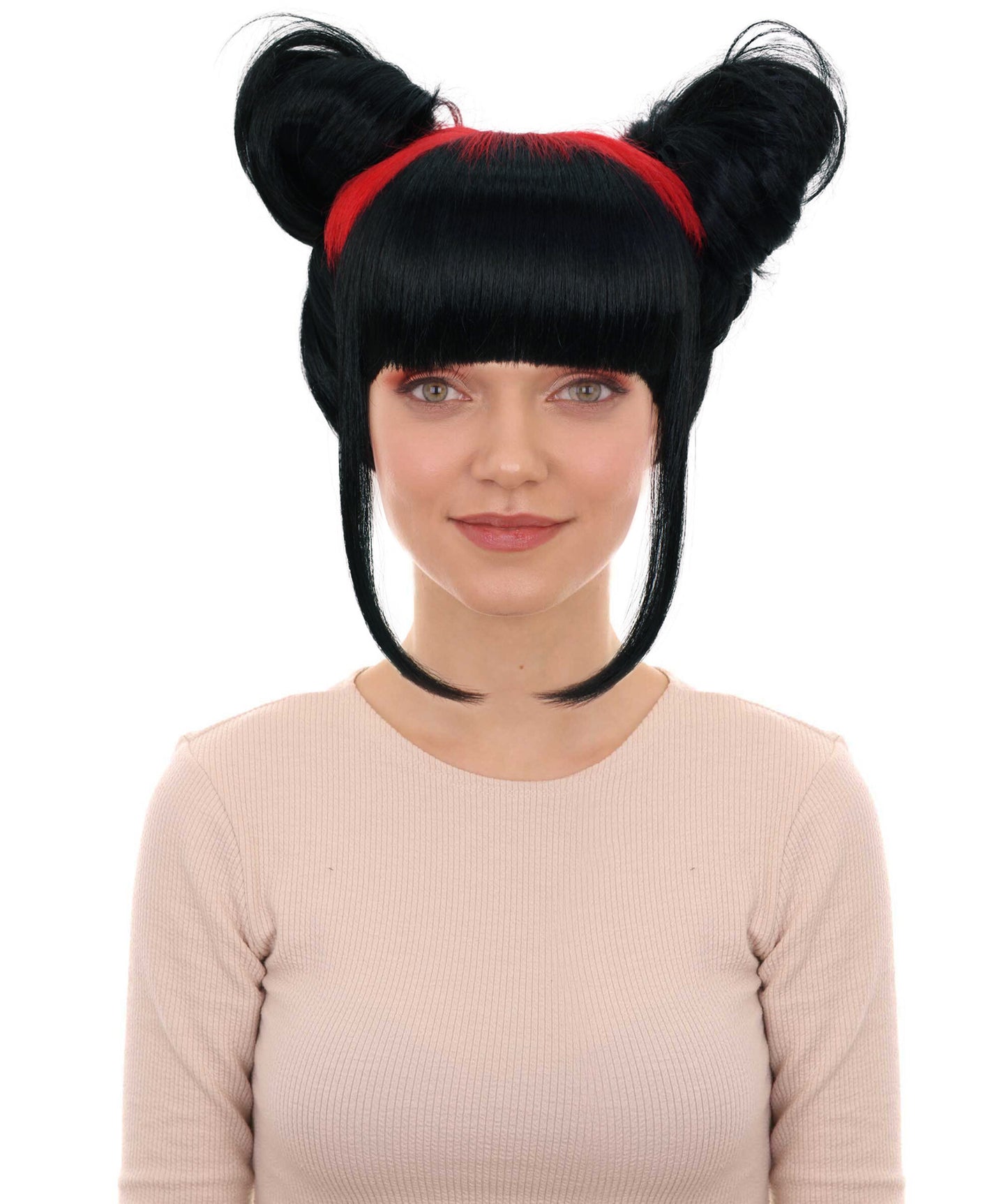 Made of flame-retardant synthetic fibers, this Black Double Bun Wig also comes with an adjustable strap to fit any head size.