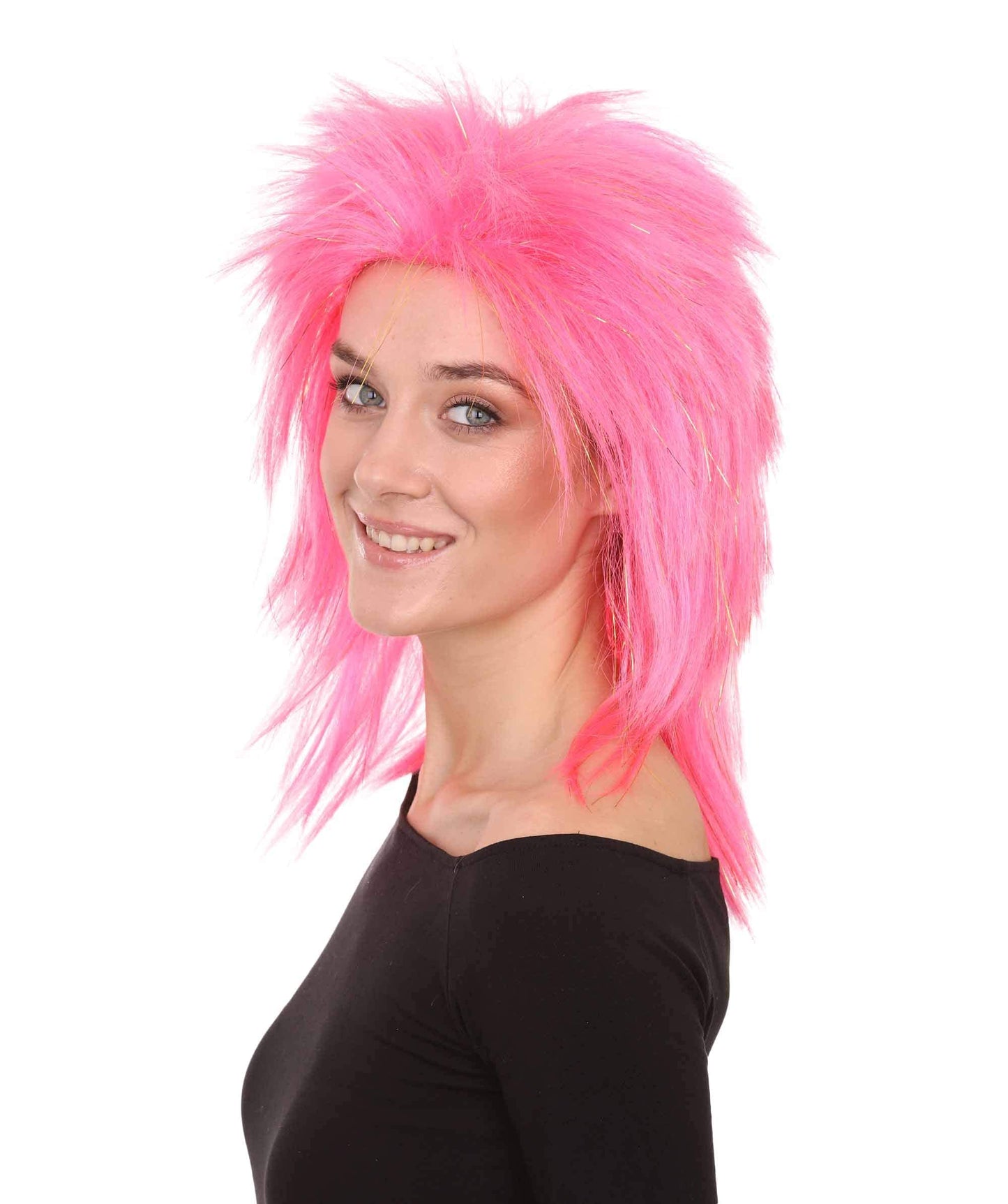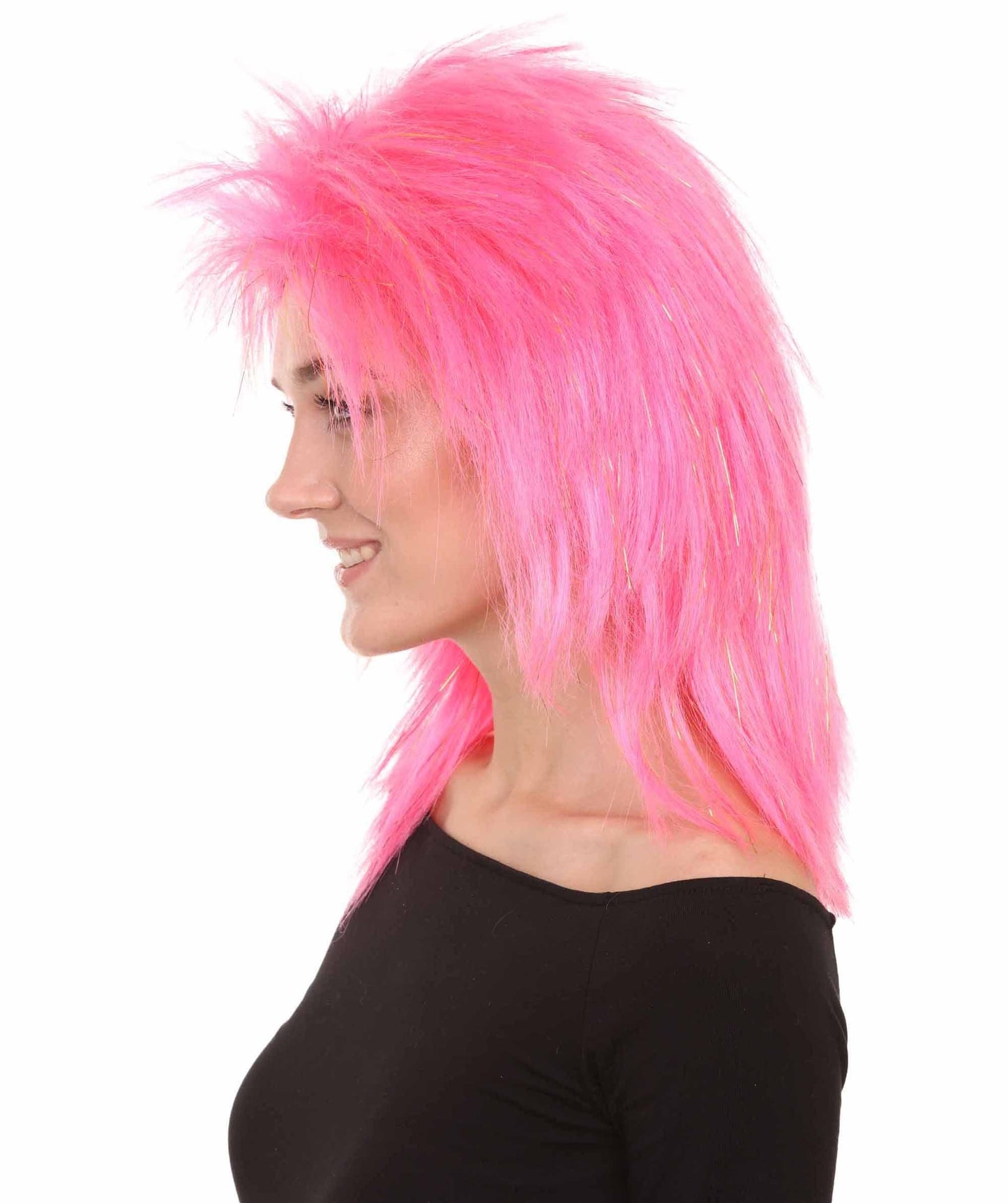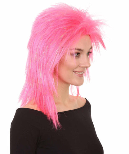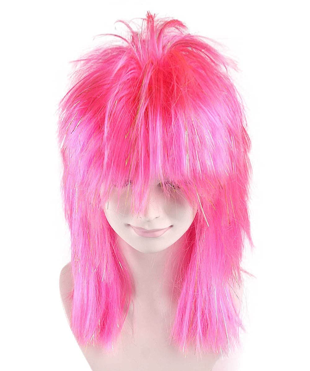 HPO Unisex Punk Metal Rocker Tinsel 80's Mullet Wig | Pink Tinsel Halloween Wig | Flame-retardant Synthetic Fiber