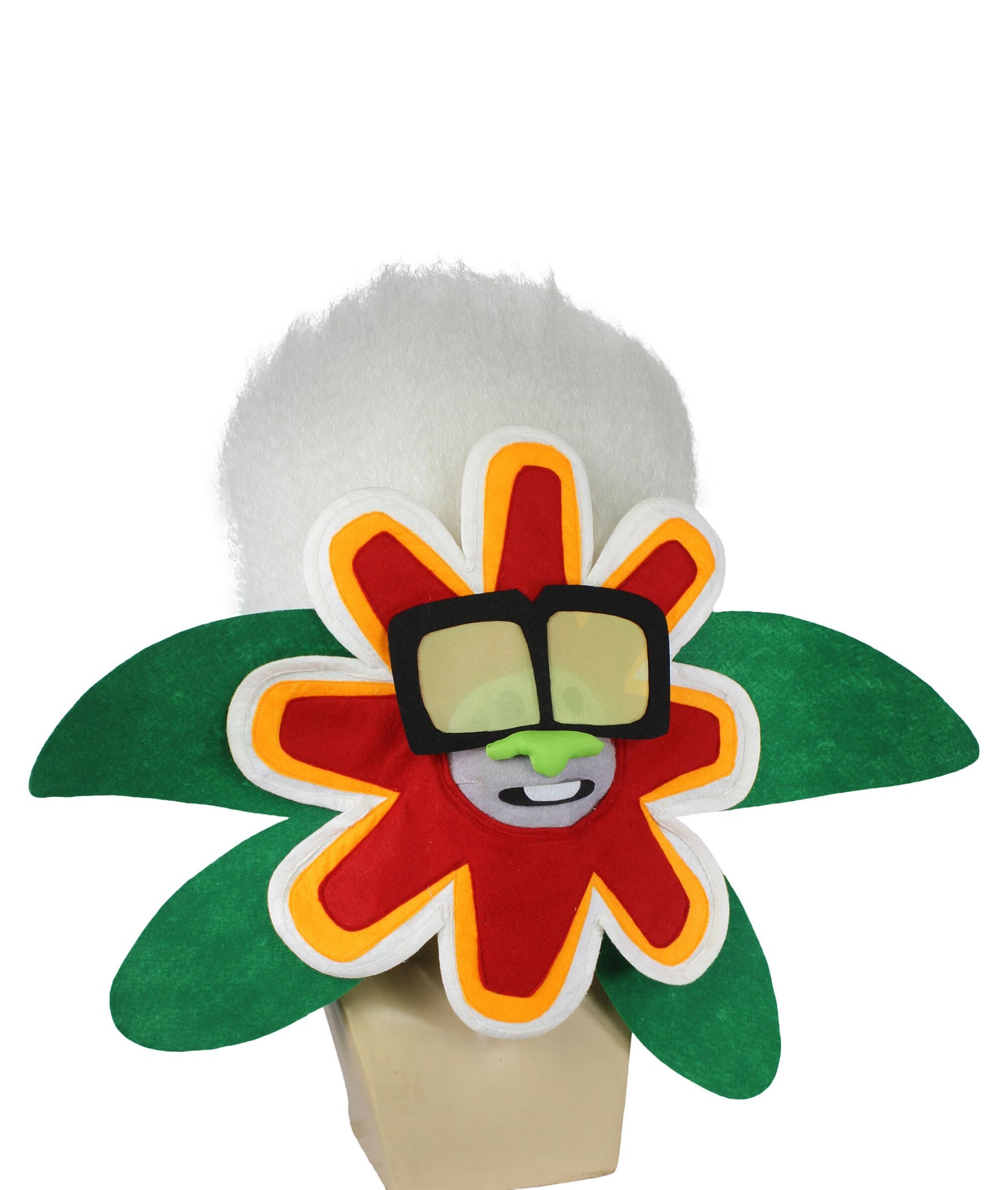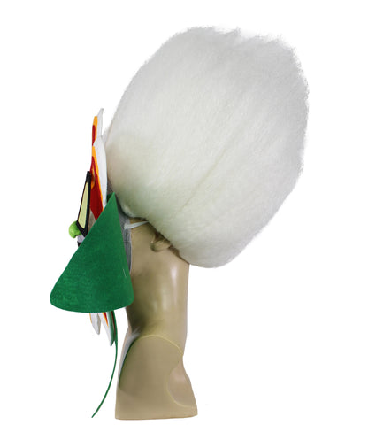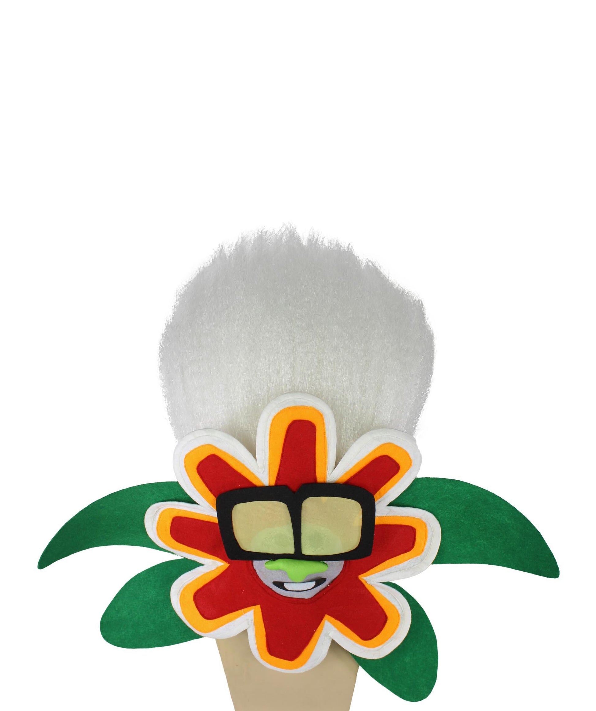 Meet the White Tiny Troll Wig with Flower Face, a whimsical accessory inspired by a beloved animated musical movie. This captivating wig embodies a cherished character, a replica with silver skin, metallic hair, blue eyes, and a mischievous green nose. Despite his tender age, his voice holds a surprisingly deep timbre, adding a unique charm. The character wears oversized black glasses with yellow lenses and sparkling diamond earrings. Balancing flair with innocence, he exudes youthful exuberance and mature sophistication. Ideal for Halloween events.