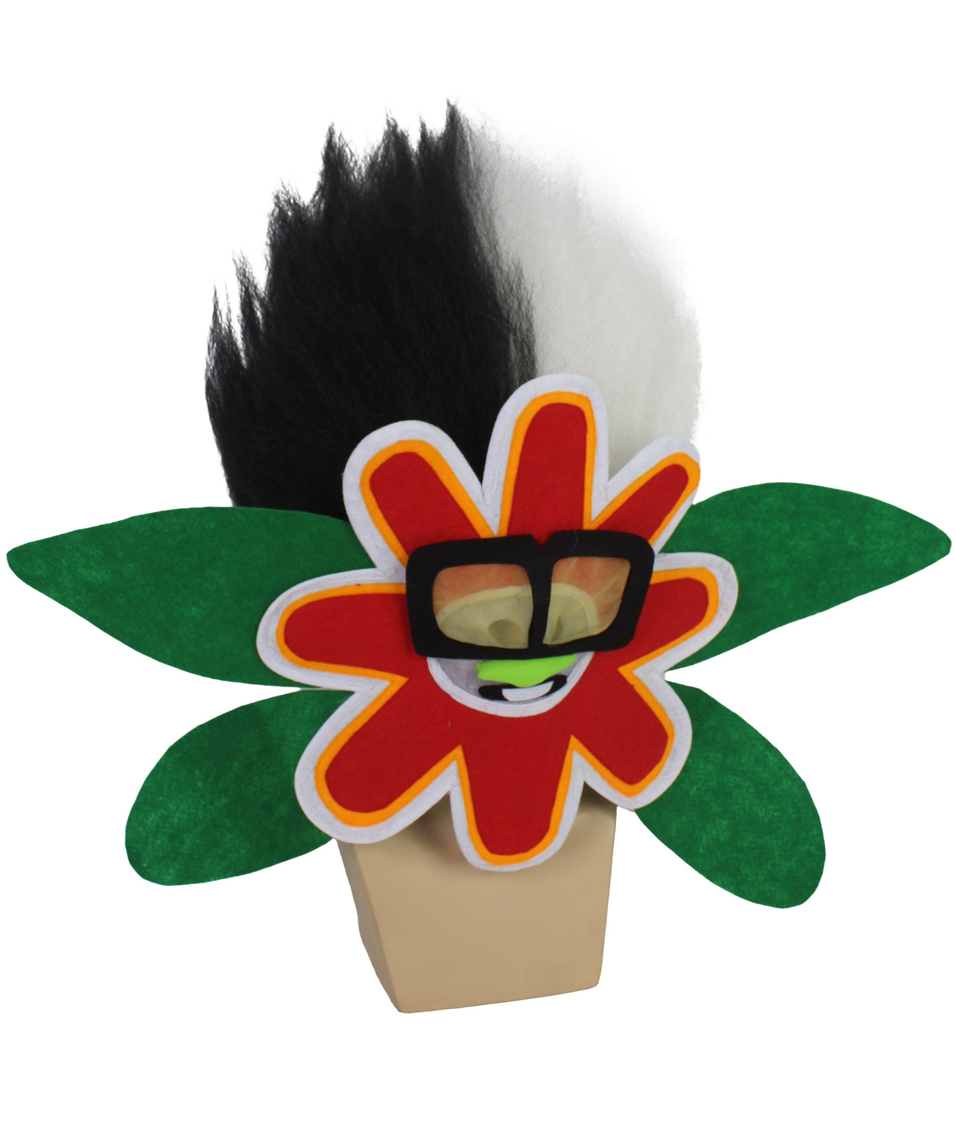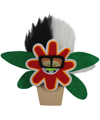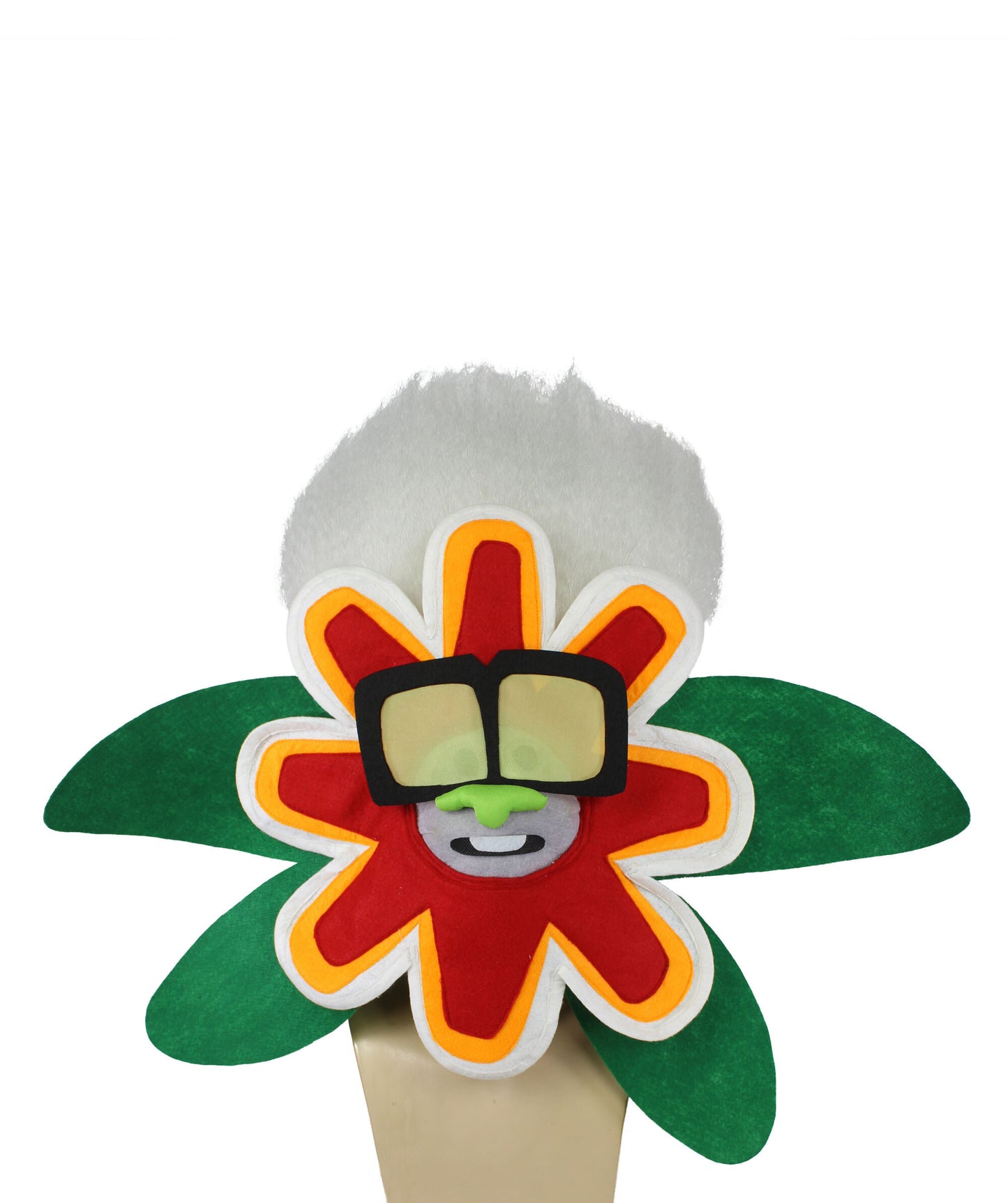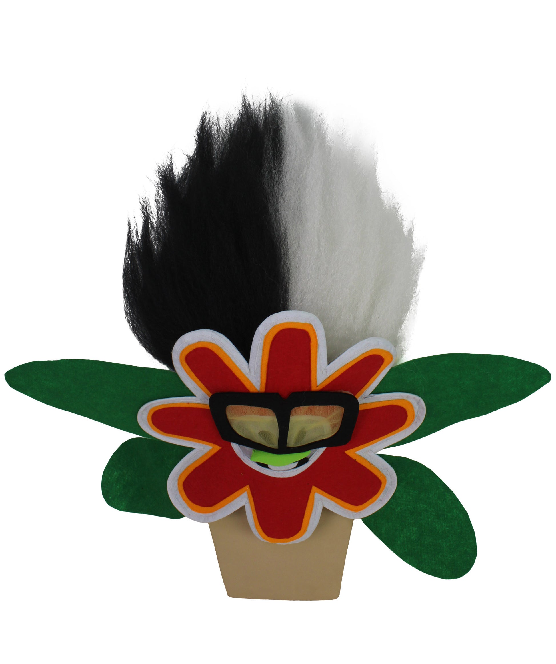 Meet the White Tiny Troll Wig with Flower Face, a whimsical accessory inspired by a beloved animated musical movie. This captivating wig embodies a cherished character, a replica with silver skin, metallic hair, blue eyes, and a mischievous green nose. Despite his tender age, his voice holds a surprisingly deep timbre, adding a unique charm. The character wears oversized black glasses with yellow lenses and sparkling diamond earrings. Balancing flair with innocence, he exudes youthful exuberance and mature sophistication. Ideal for Halloween events.