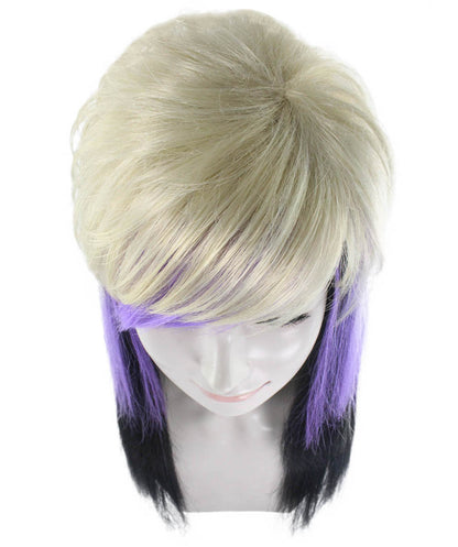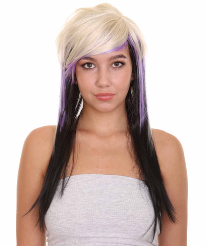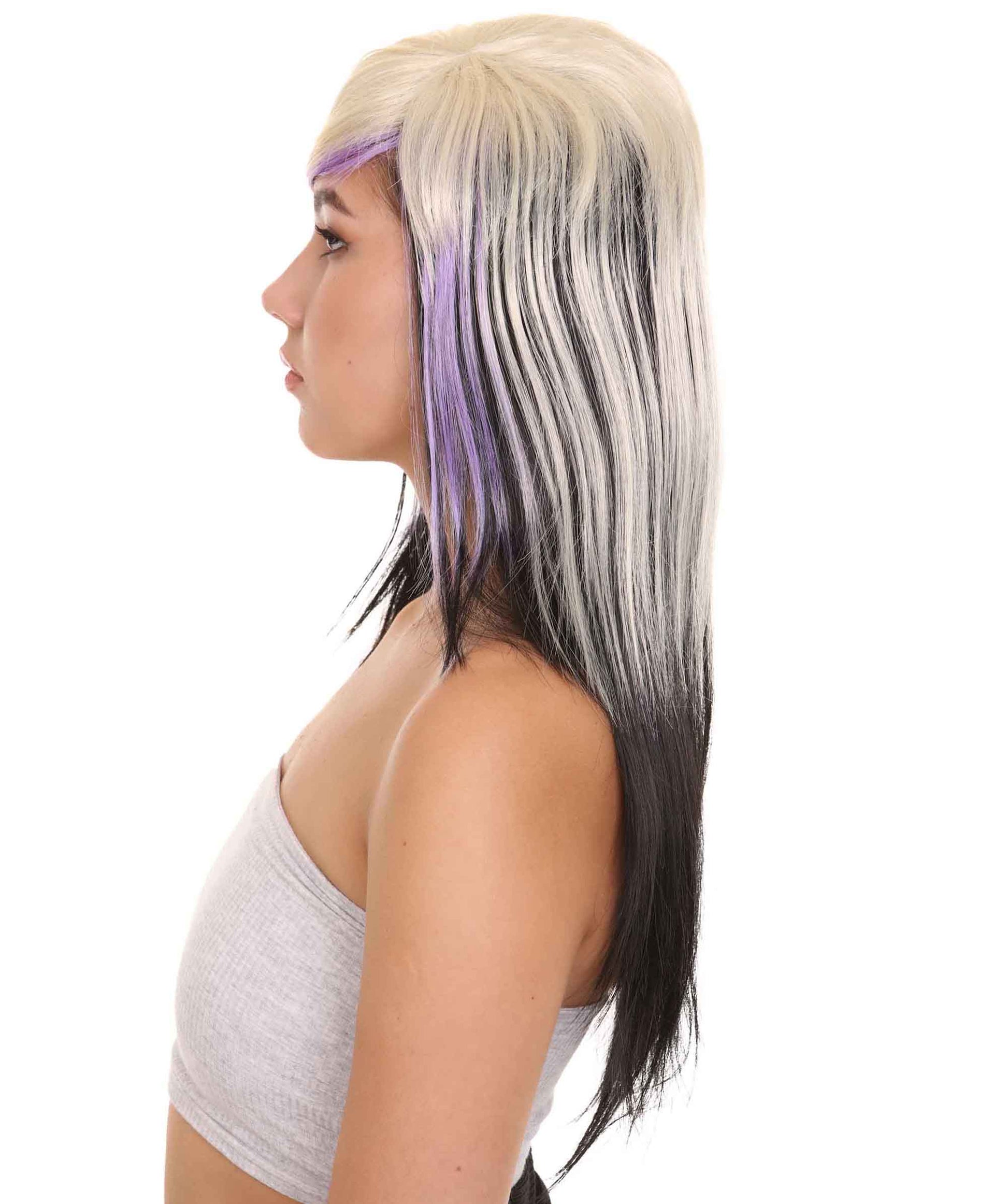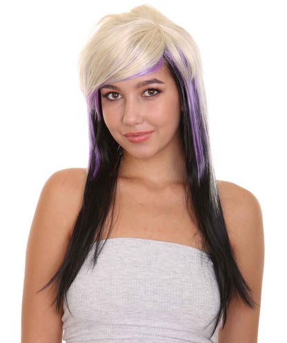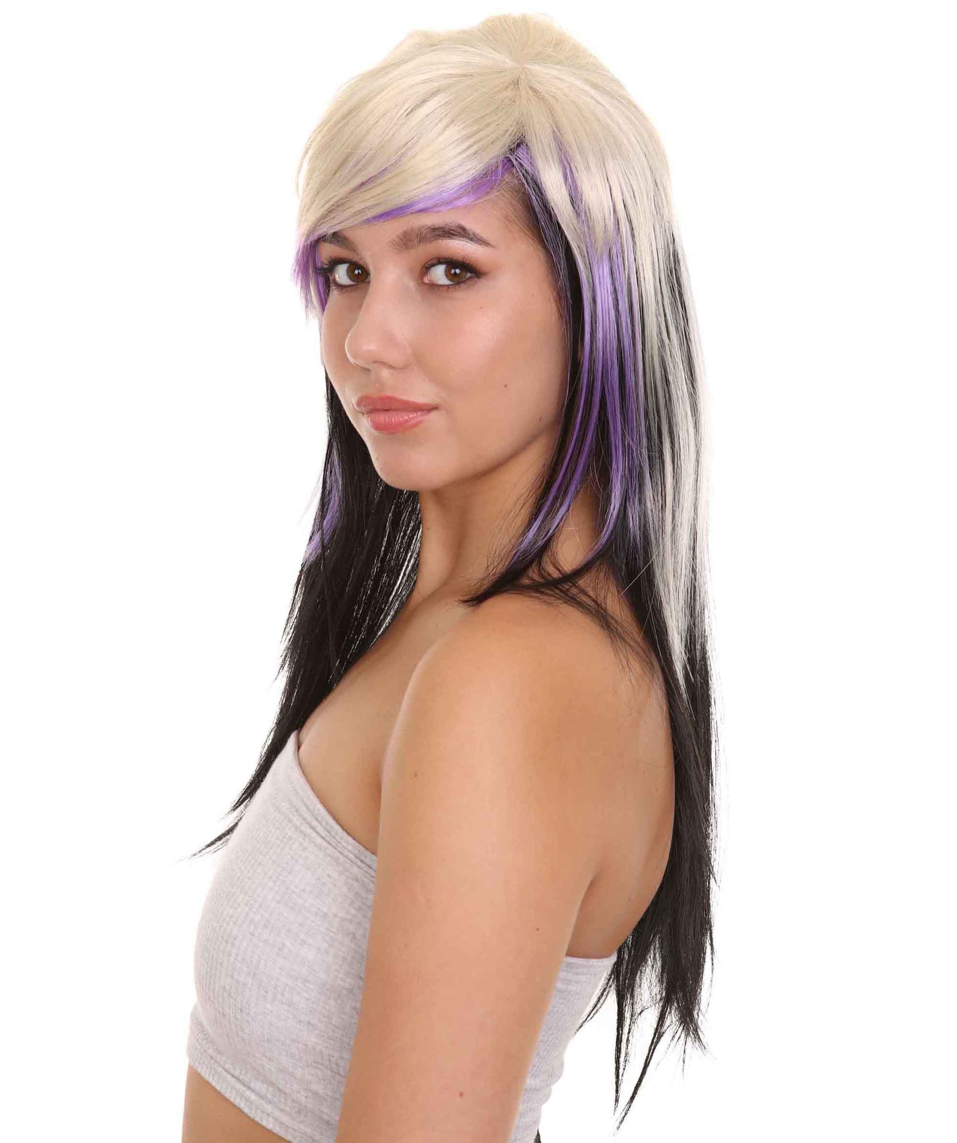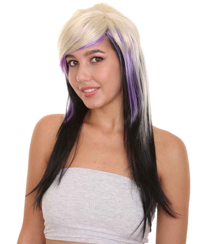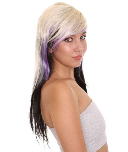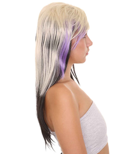 Get ready to unleash your inner vampire with the Vampire Women's Wig from HPO, the top synthetic wig and costume brand! This long tricolor Halloween wig features a stunning combination of blonde, black, and purple, perfect for creating a ghostly and horror-inspired look for cosplay, Halloween parties, parades, festivals, comic cons, and more!