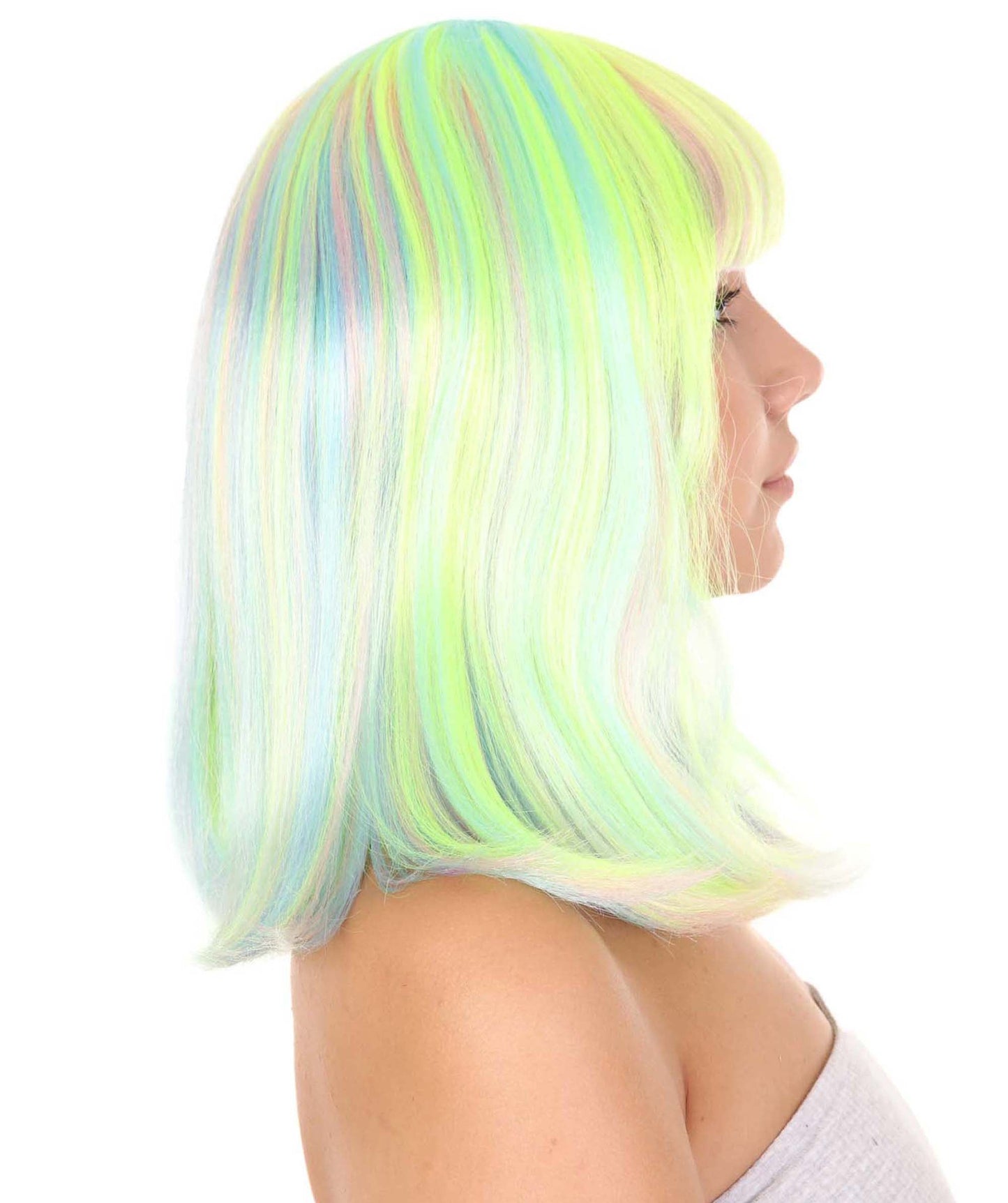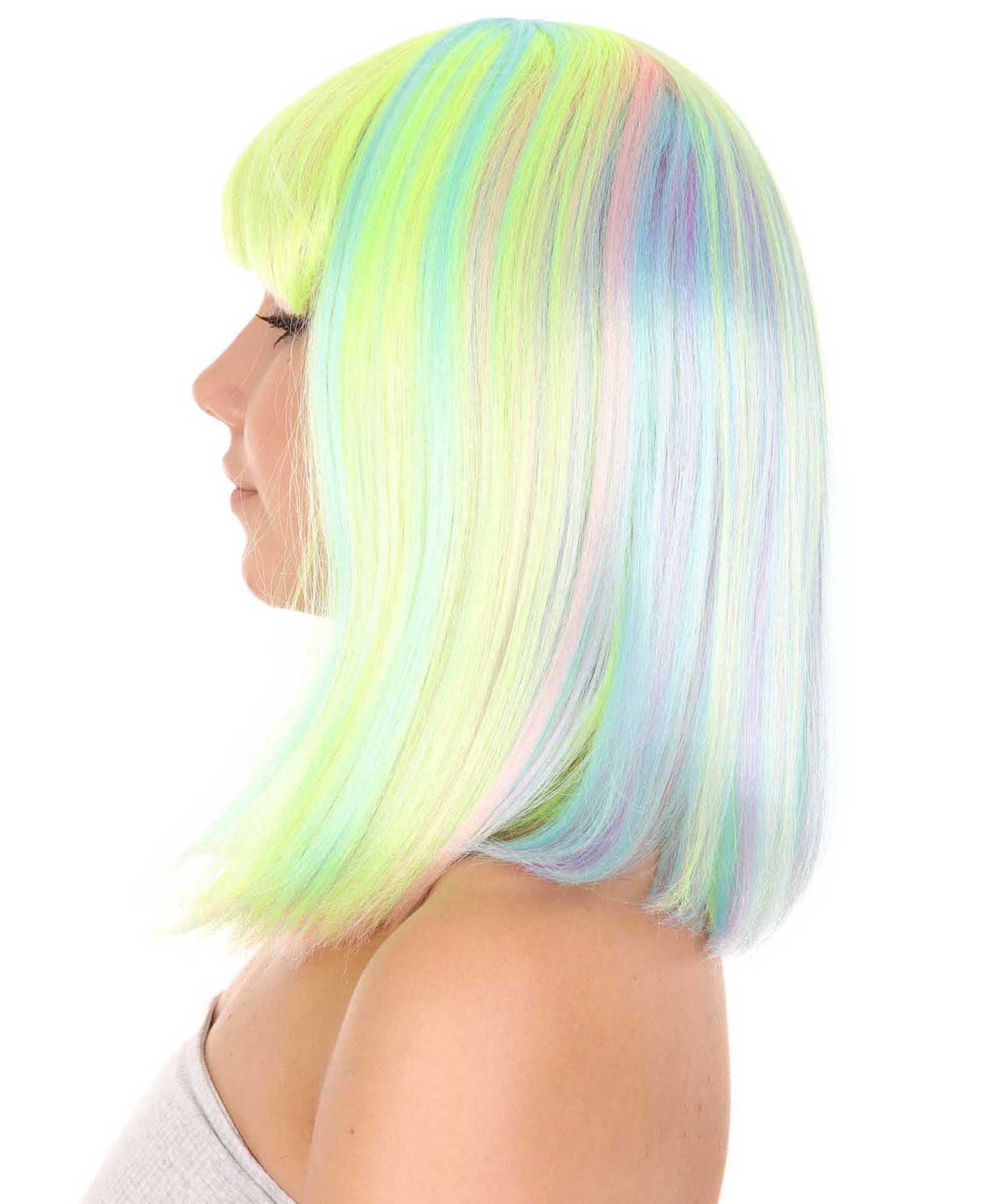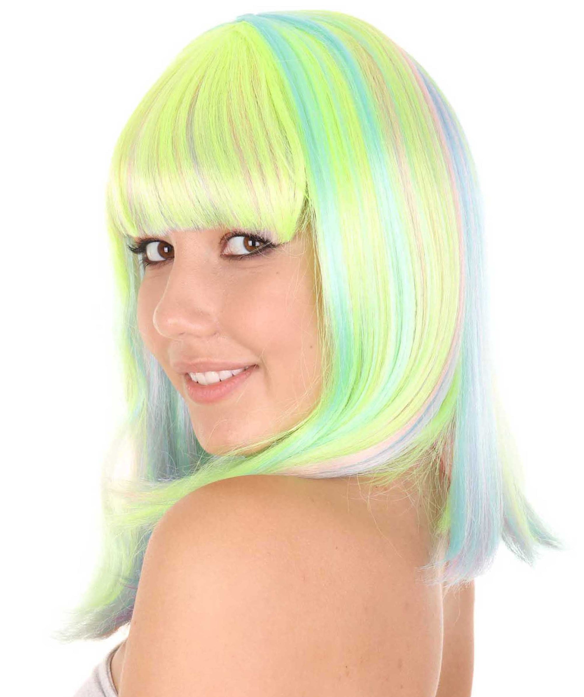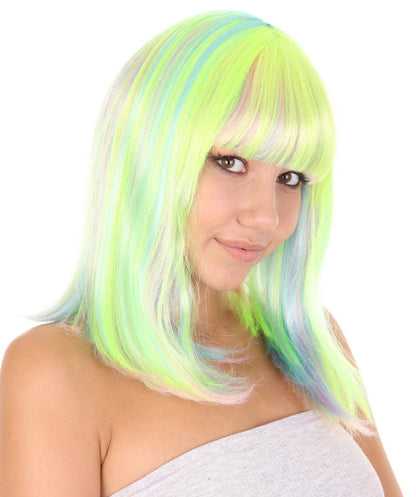 This is the Women’s Bob Wig from HPO, the perfect accessory to take your party outfit to the next level. This medium-length synthetic wig comes in a bold and eye-catching green and yellow color combination that is perfect for Halloween, parties, parades, and carnivals.