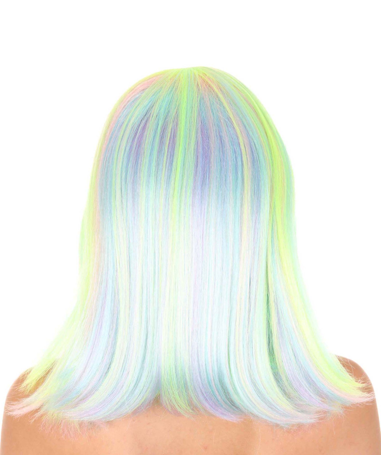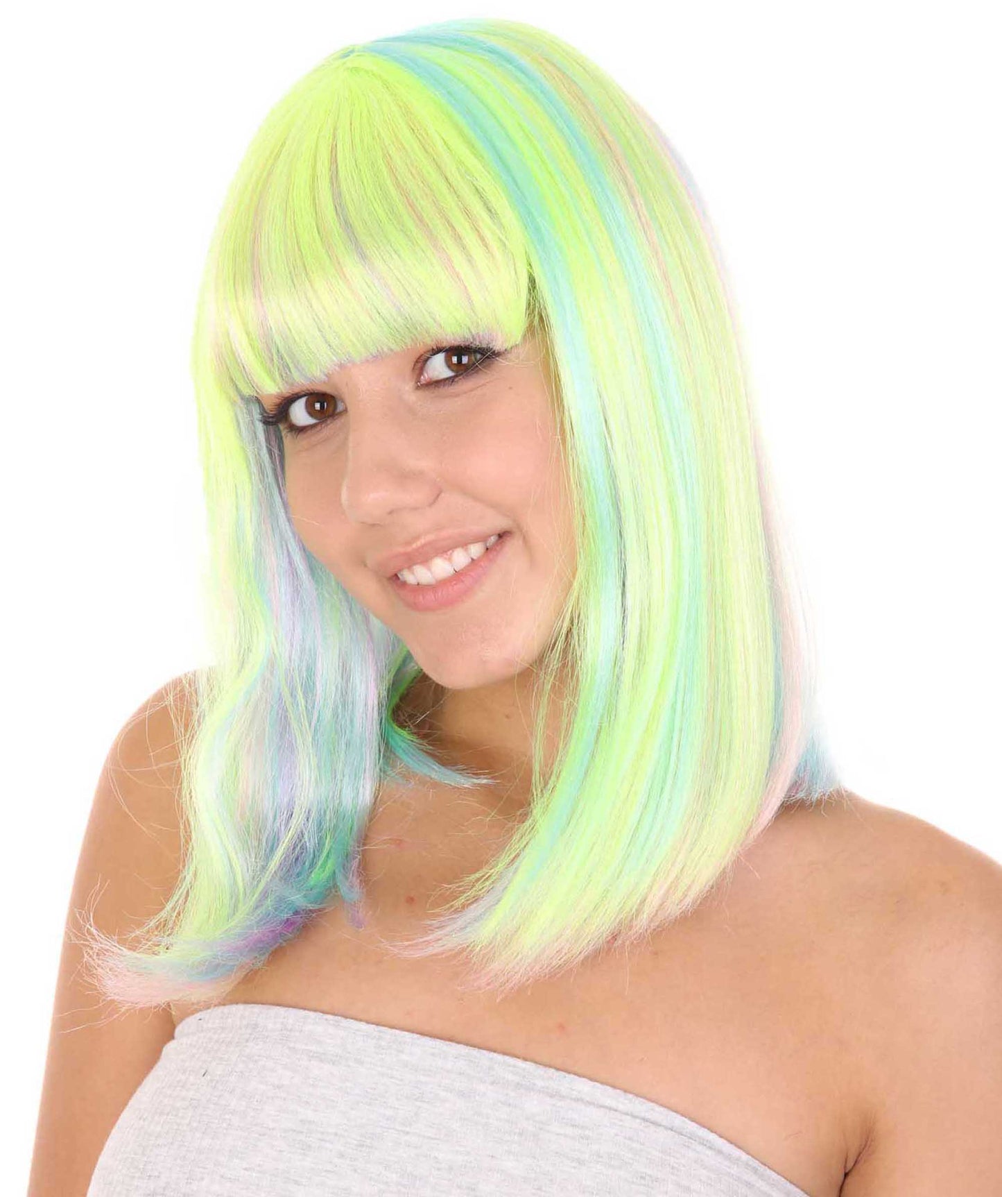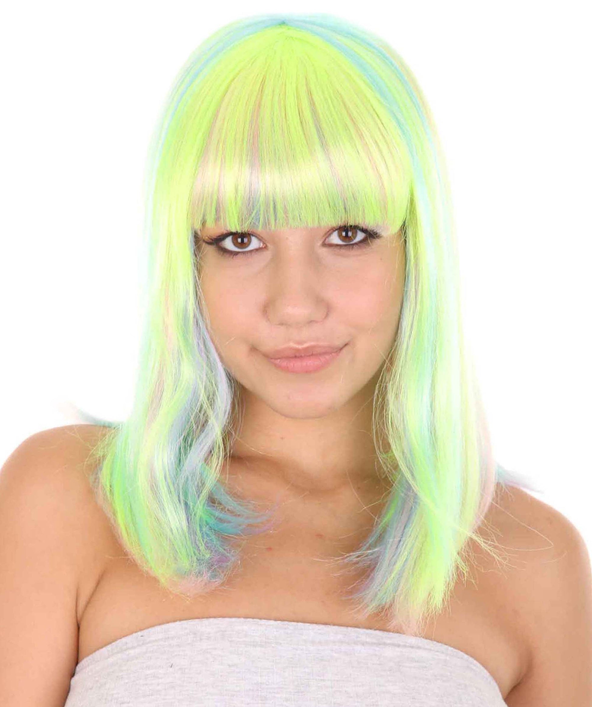 This is the Women’s Bob Wig from HPO, the perfect accessory to take your party outfit to the next level. This medium-length synthetic wig comes in a bold and eye-catching green and yellow color combination that is perfect for Halloween, parties, parades, and carnivals.