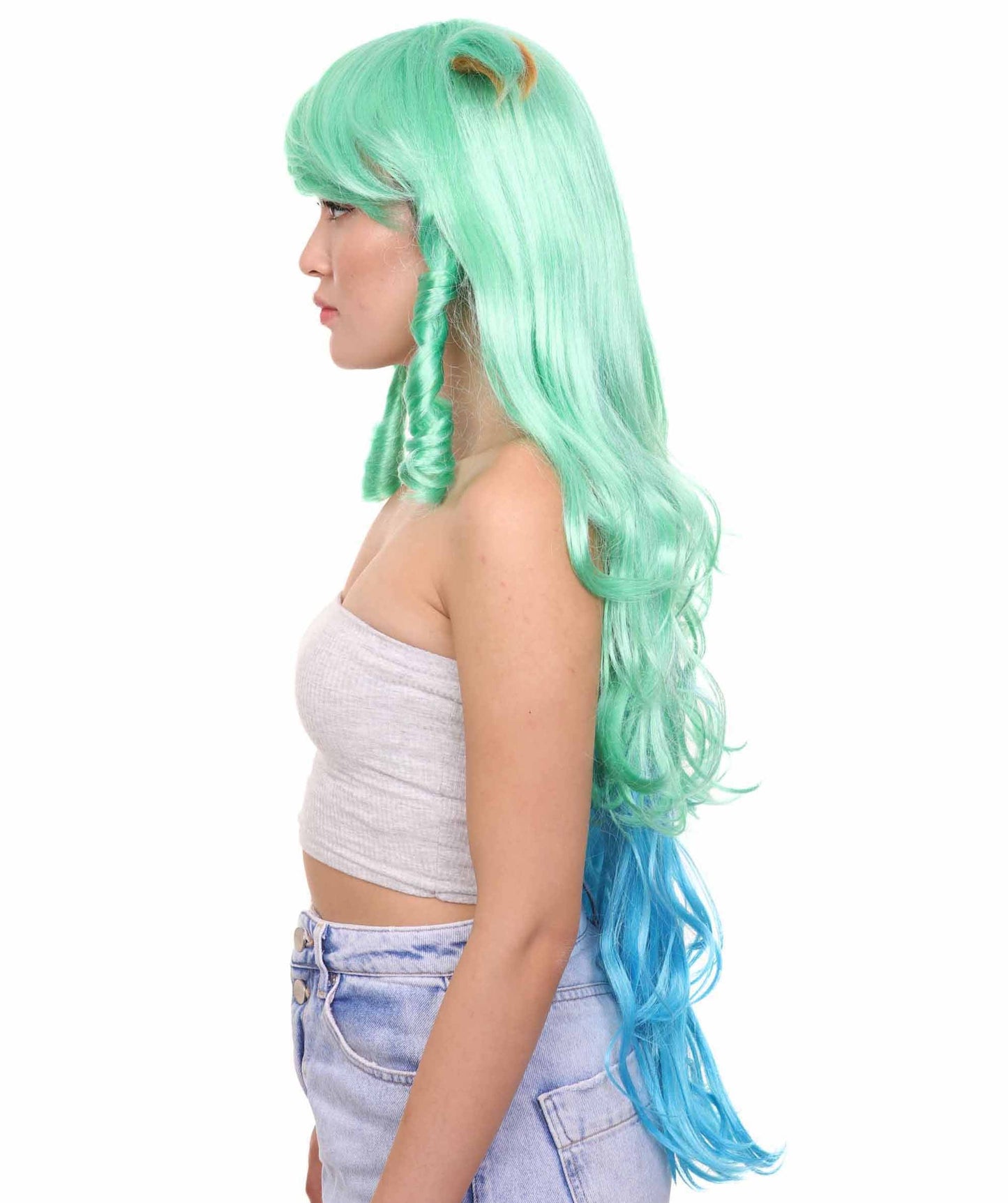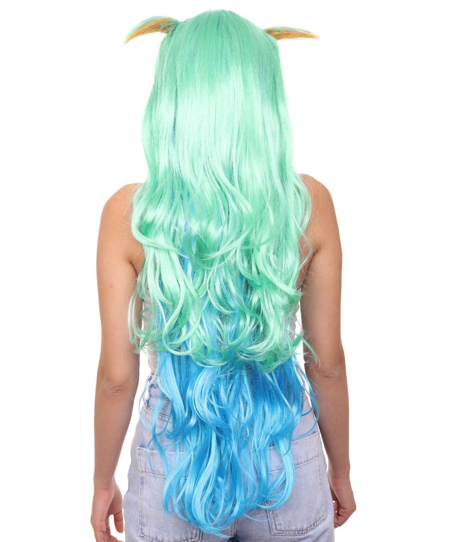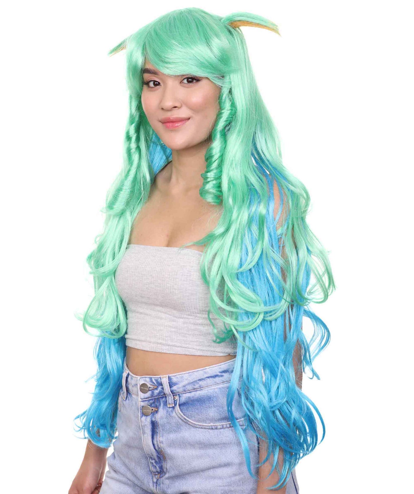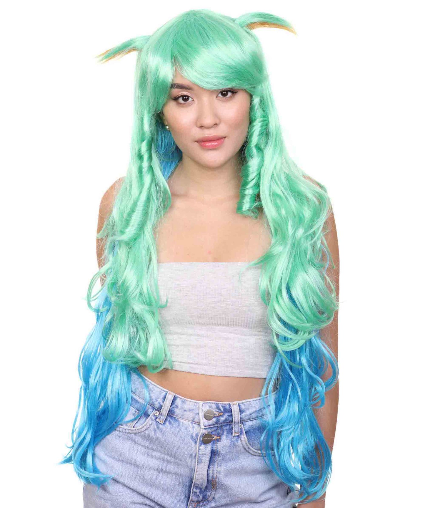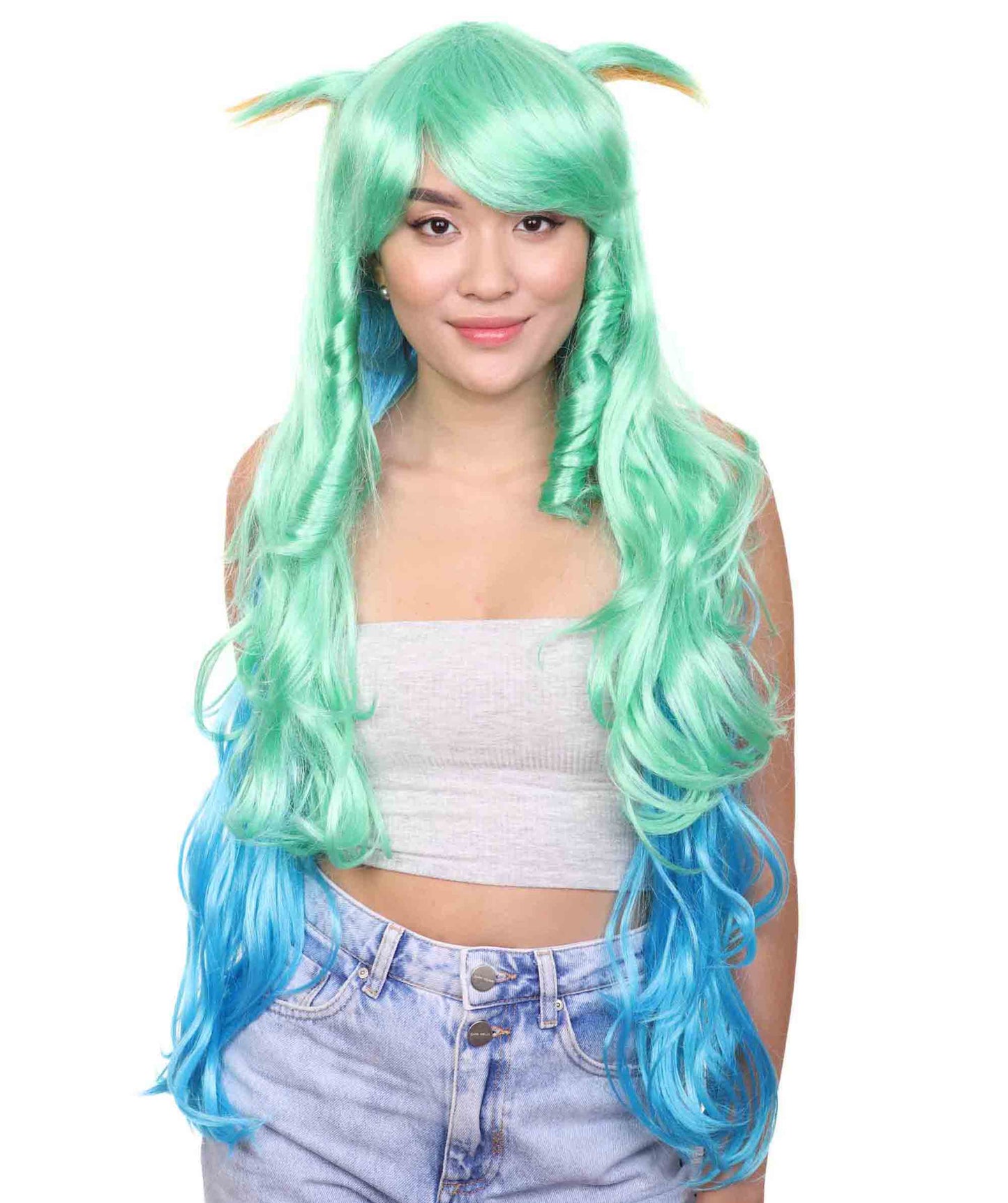 Womens Gaming Wig , Green and Blue Anime Wigs , Premium Breathable Capless Cap