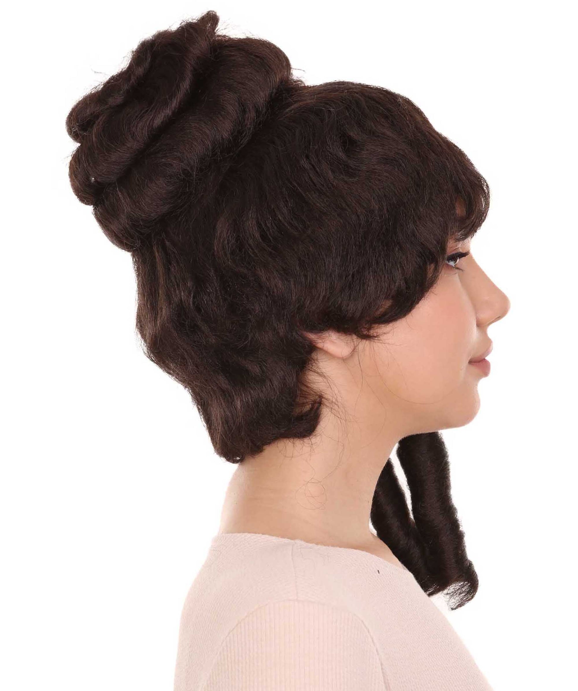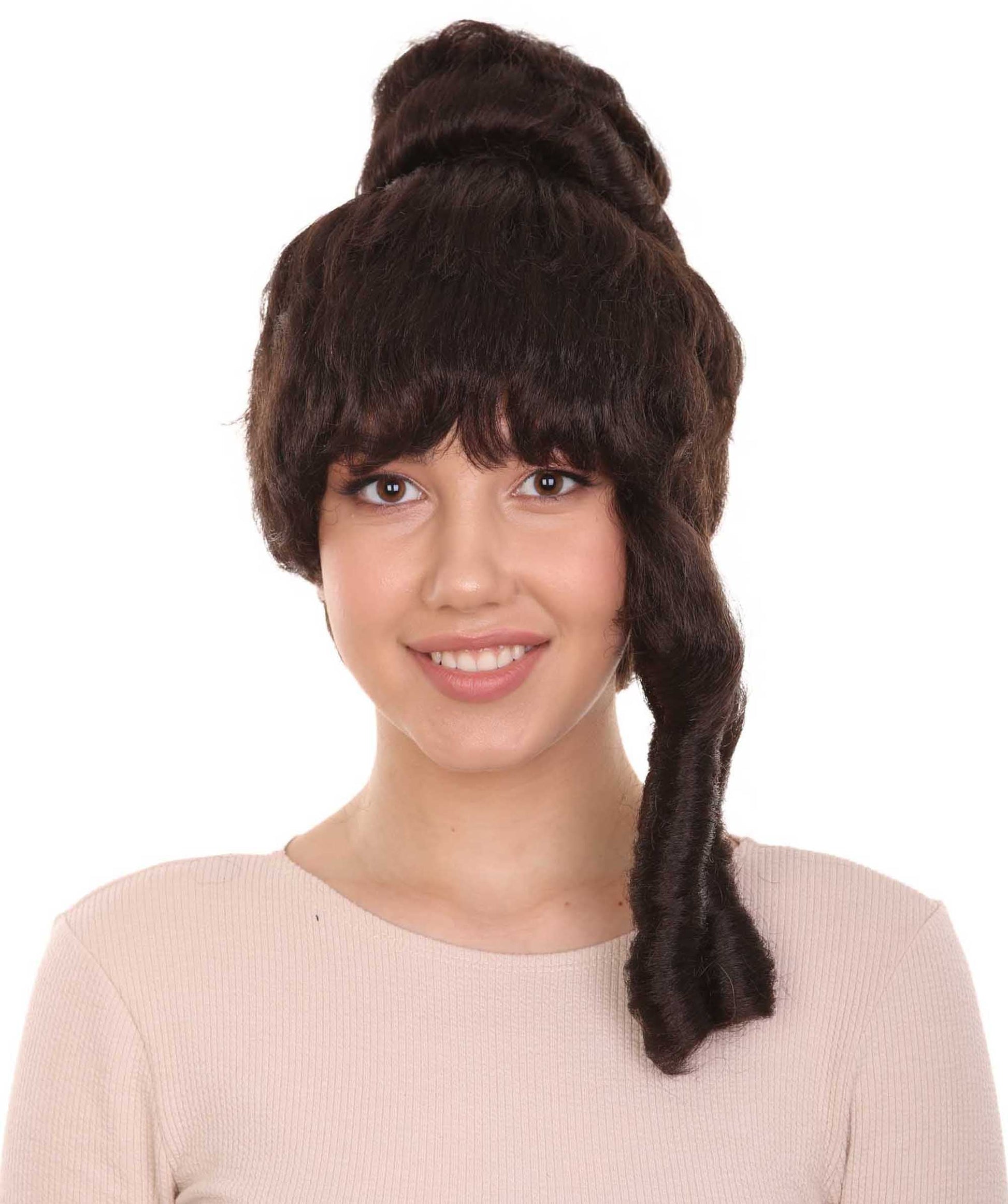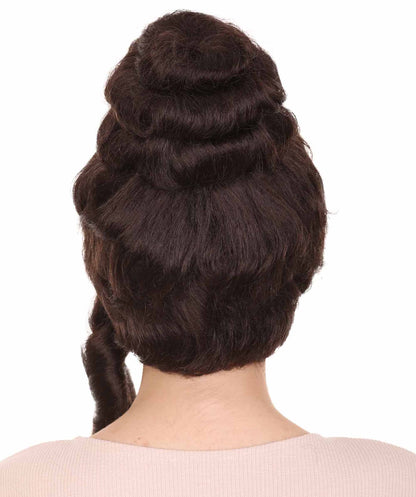 It is designed to replicate the hairstyles of colonial-era women. This dark brown historical wig is perfect for any party, including Halloween, Mardi Gras carnivals, theme parties, and other cosplay events. Its authenticity and attention to detail make it a must-have accessory for anyone interested in the fashion of the past.