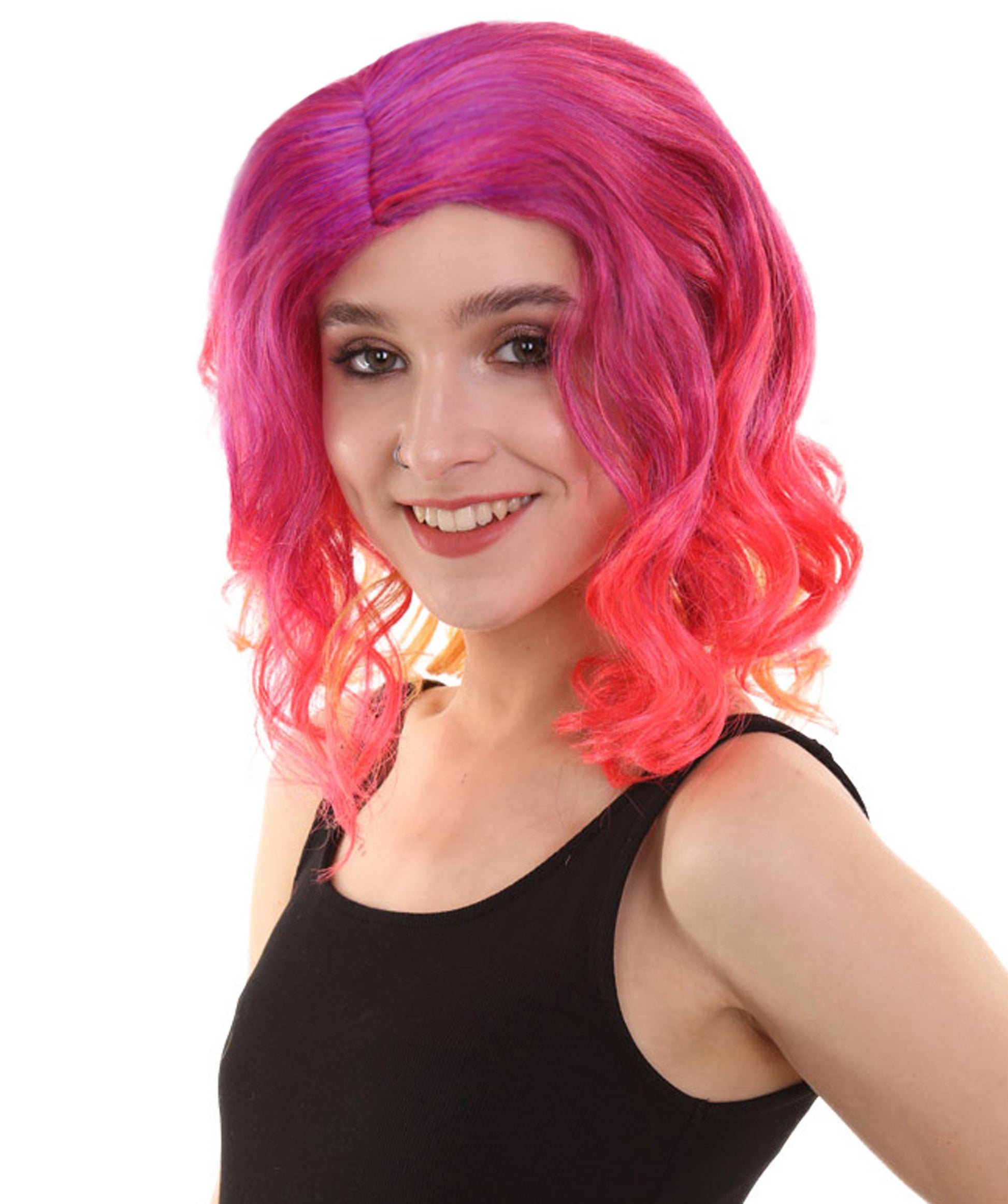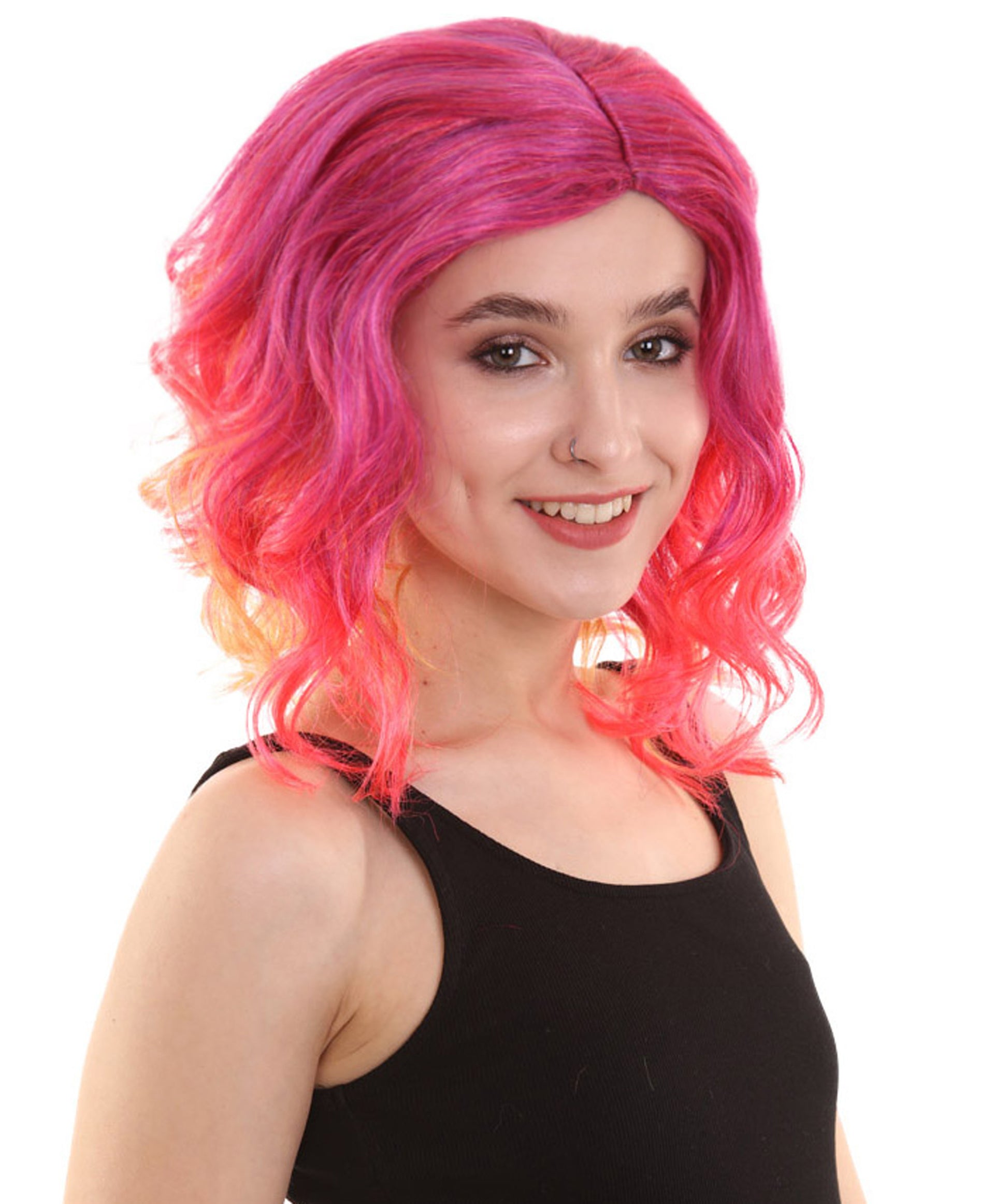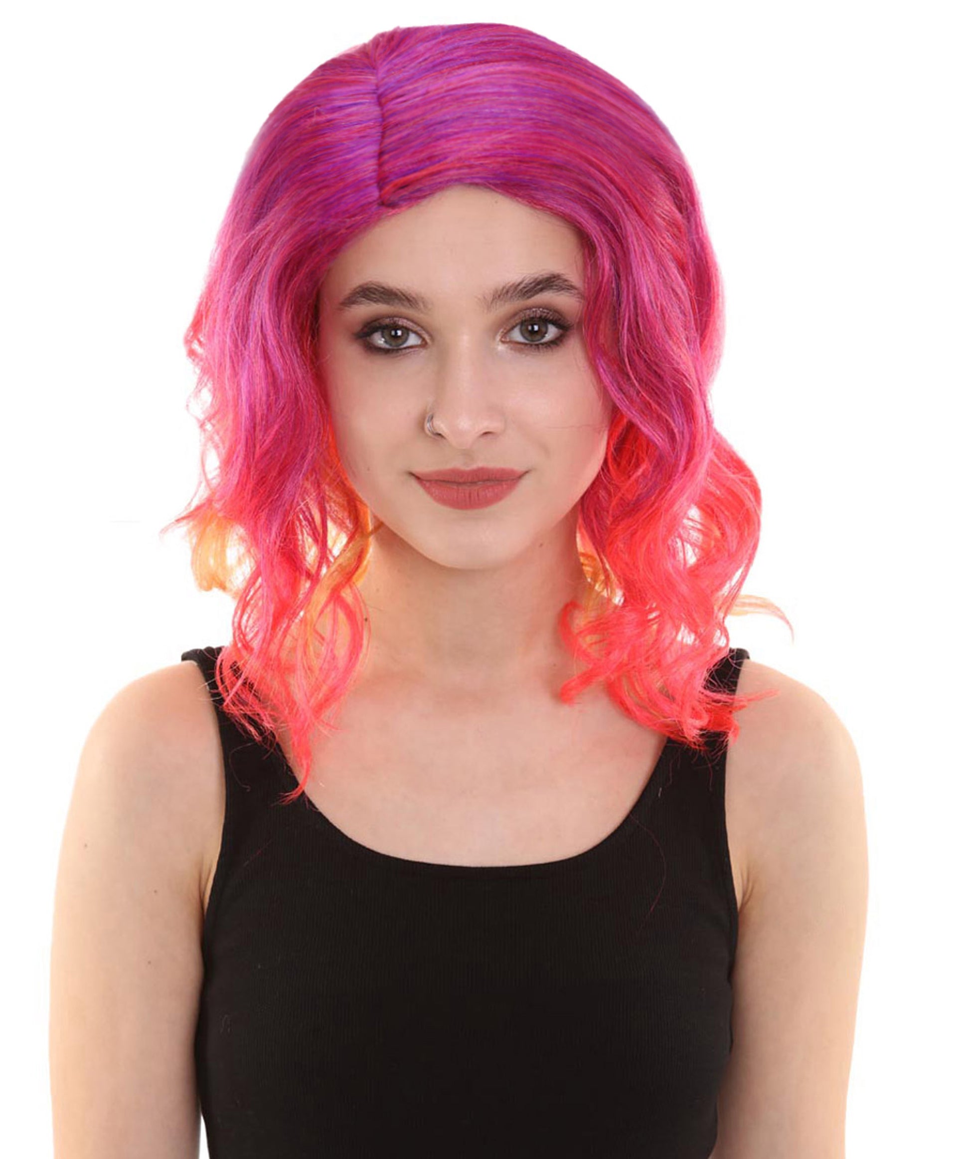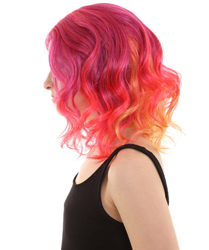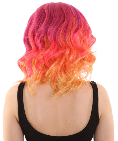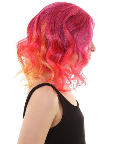 Welcome the summer with this beautiful Sunset Wig. This hairpiece is unique and trendy, and will create a head turning look. It is a great choice for Halloween and cosplay. This amazing sunset wig will change your appearance instantly and will give you an iconic look. This is an amazing choice for you if you are looking for something fun yet fashionable for cosplaying. Its combination of bright colors is eye catchy and sure to make you the life of the party. This wig is in short wavy style and lightweight, so it will allow your neck and shoulder to breathe in the wild party. This is a premium handcrafted wig and 100% cruelty free. It comes with a breathable capless cap construction, so you will not feel any type of discomfort wearing this wig.Sunset wig
