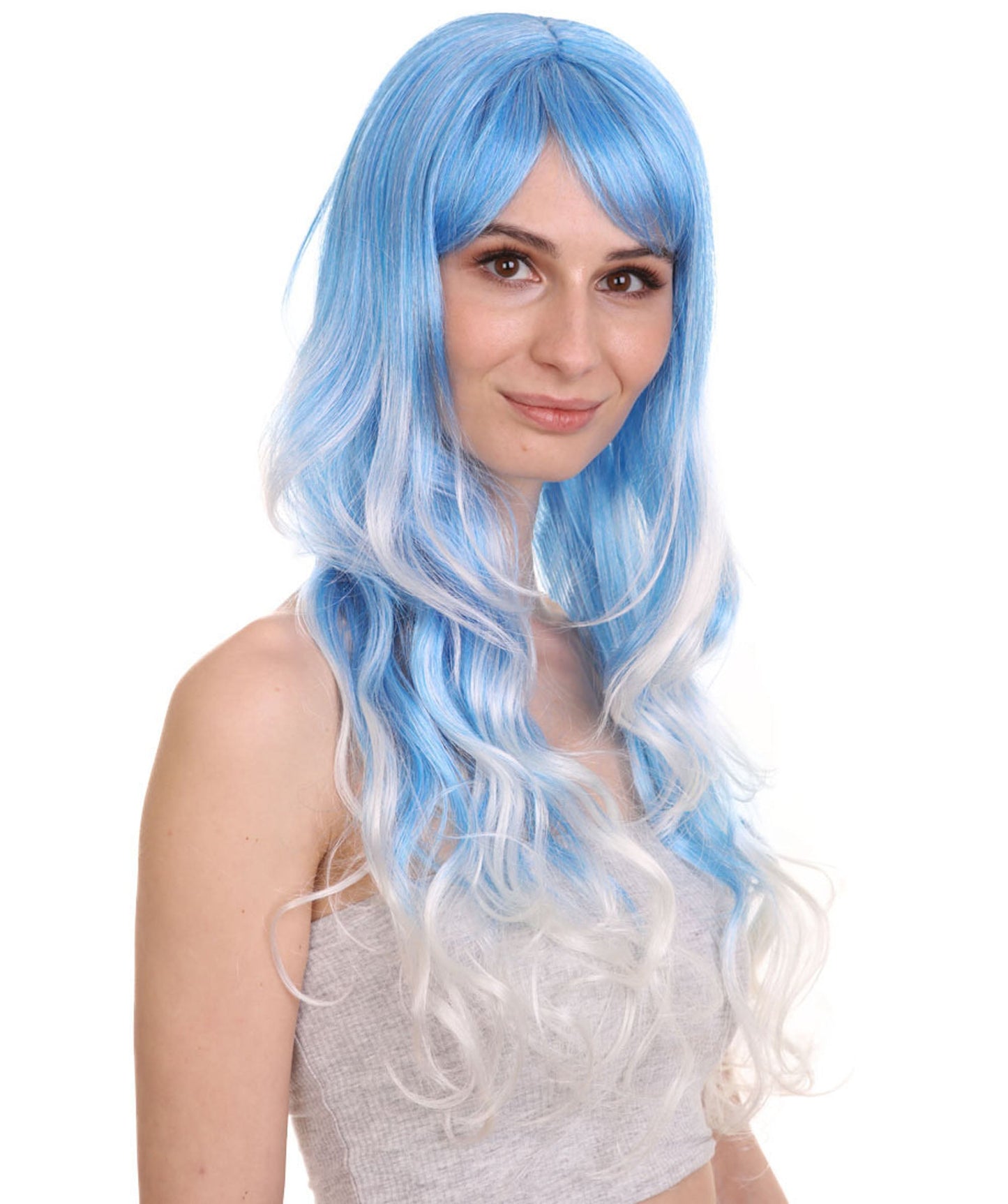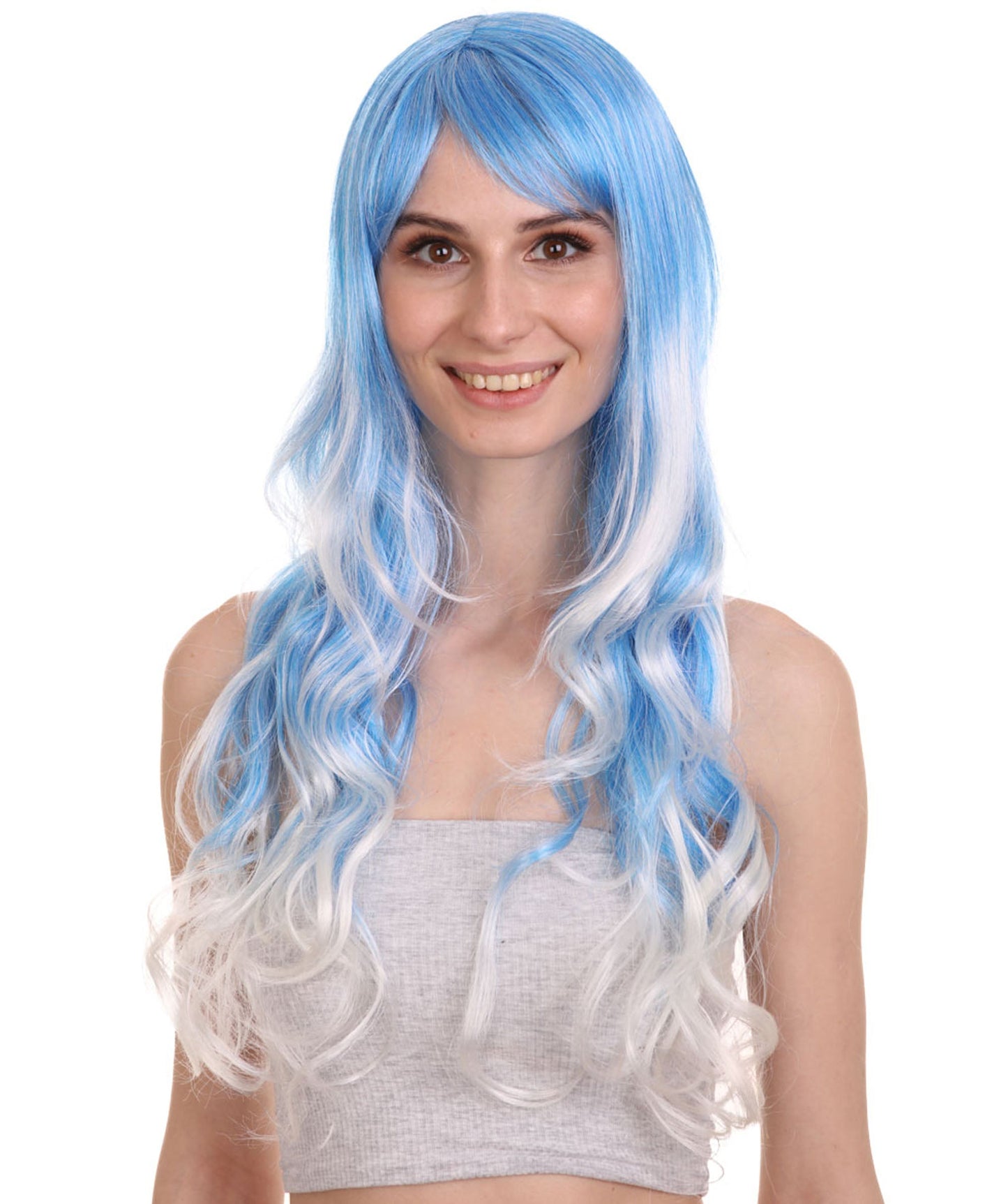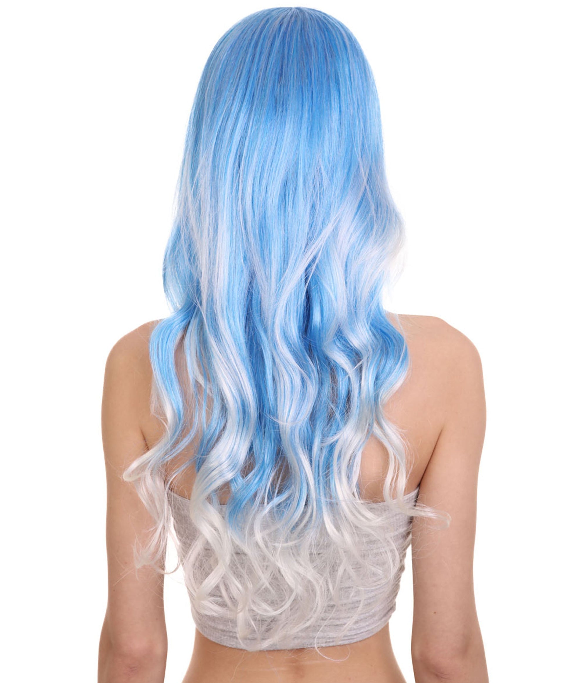 This long wavy, blue, and white ombre women's Wig is the epitome of modern and stylish hair. The blend of blue and white tones creates a unique ombre effect that transitions flawlessly from one color to the next. The long, wavy hair of this wig falls beautifully down the back, giving you a sleek, confident look that's sure to turn everyone's head.