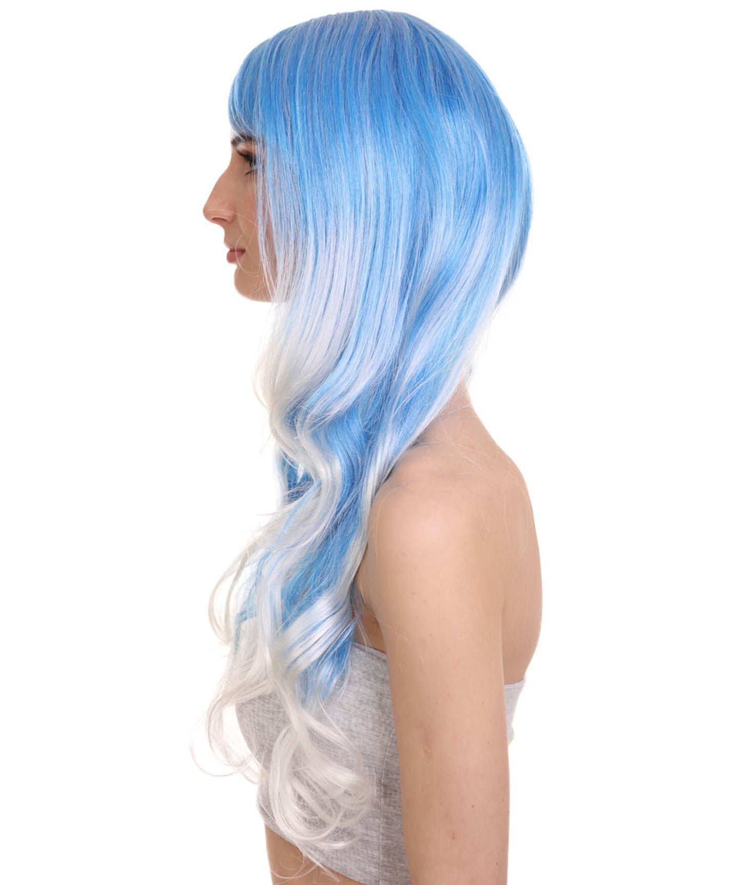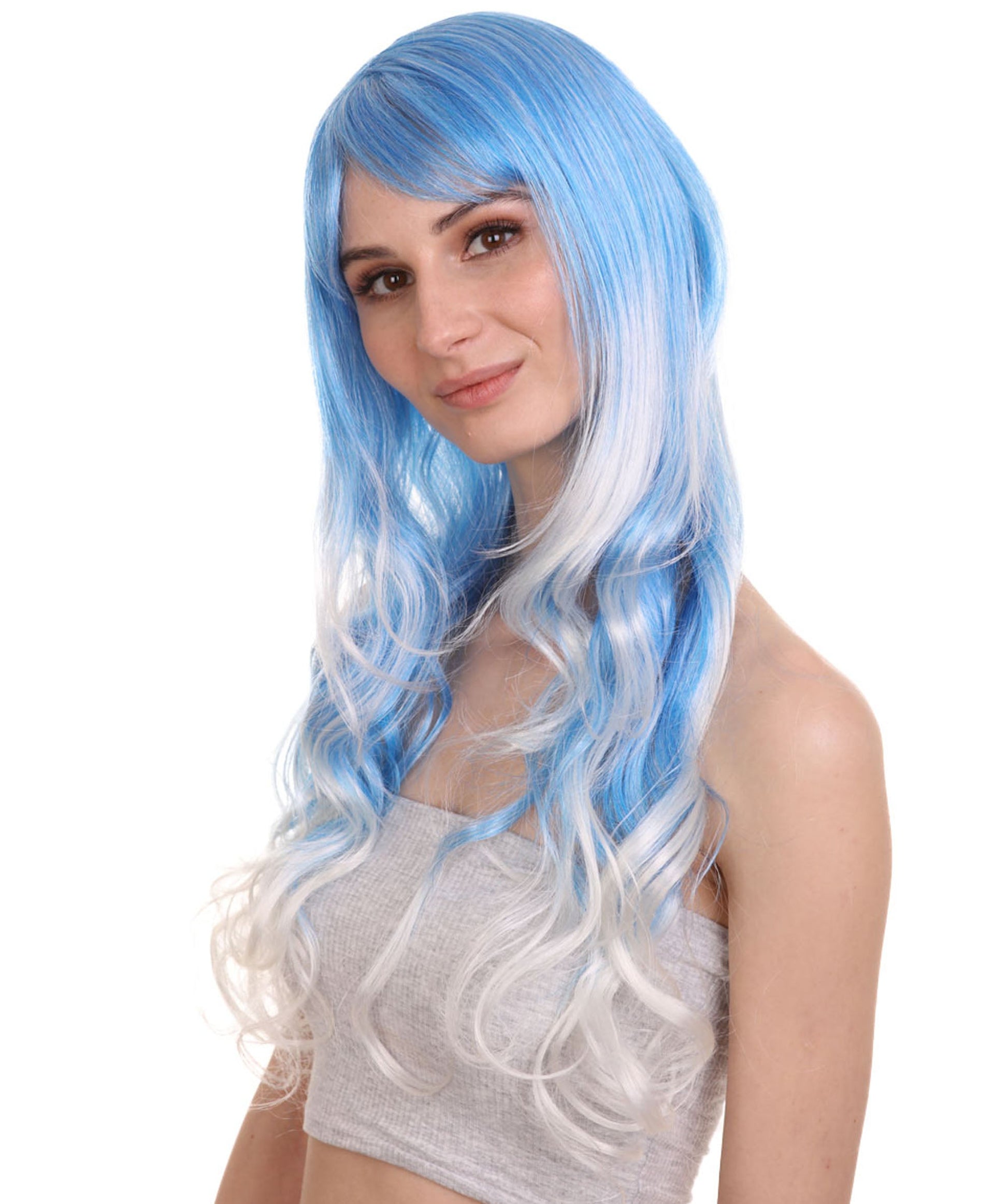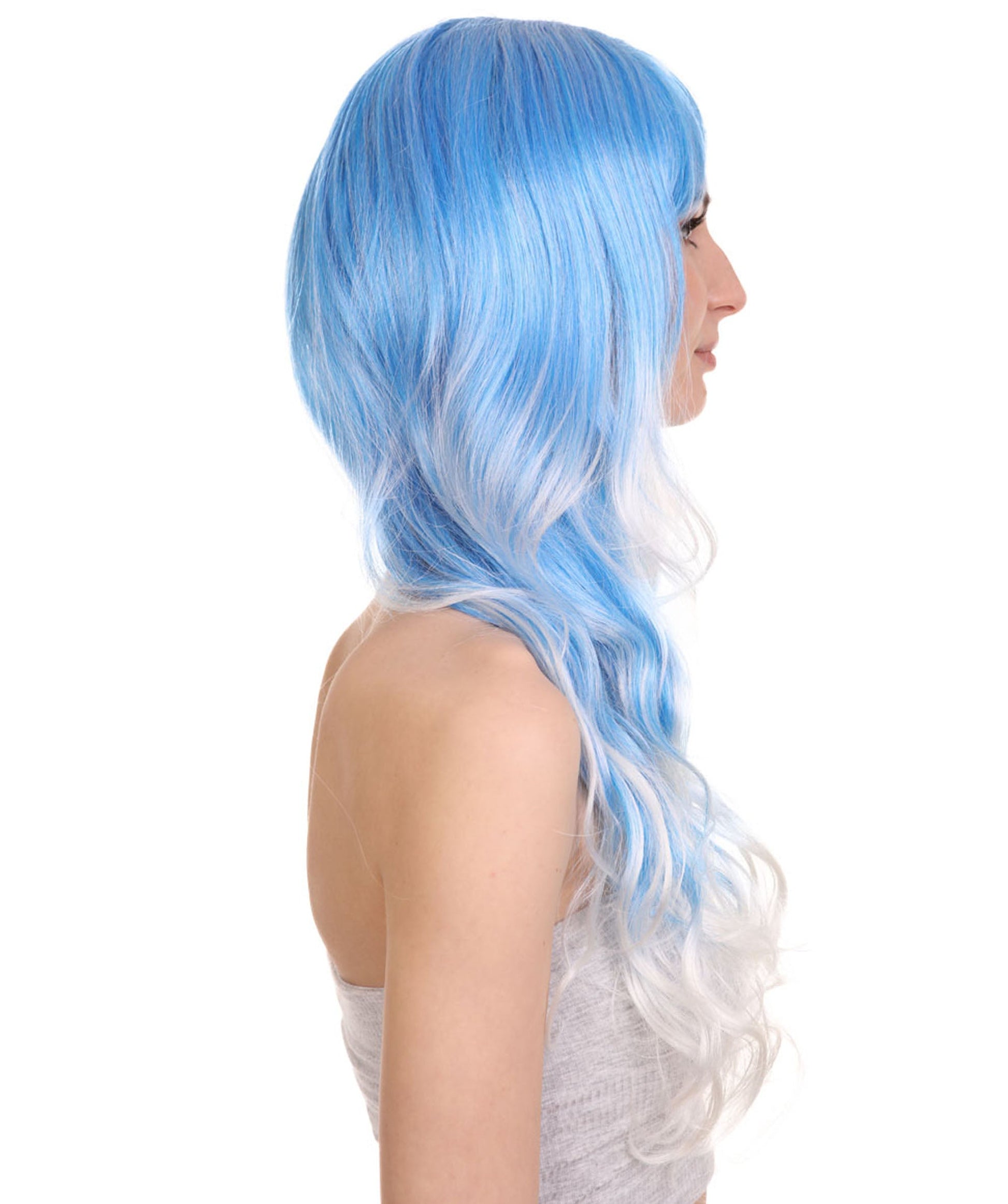 This long wavy, blue, and white ombre women's Wig is the epitome of modern and stylish hair. The blend of blue and white tones creates a unique ombre effect that transitions flawlessly from one color to the next. The long, wavy hair of this wig falls beautifully down the back, giving you a sleek, confident look that's sure to turn everyone's head.