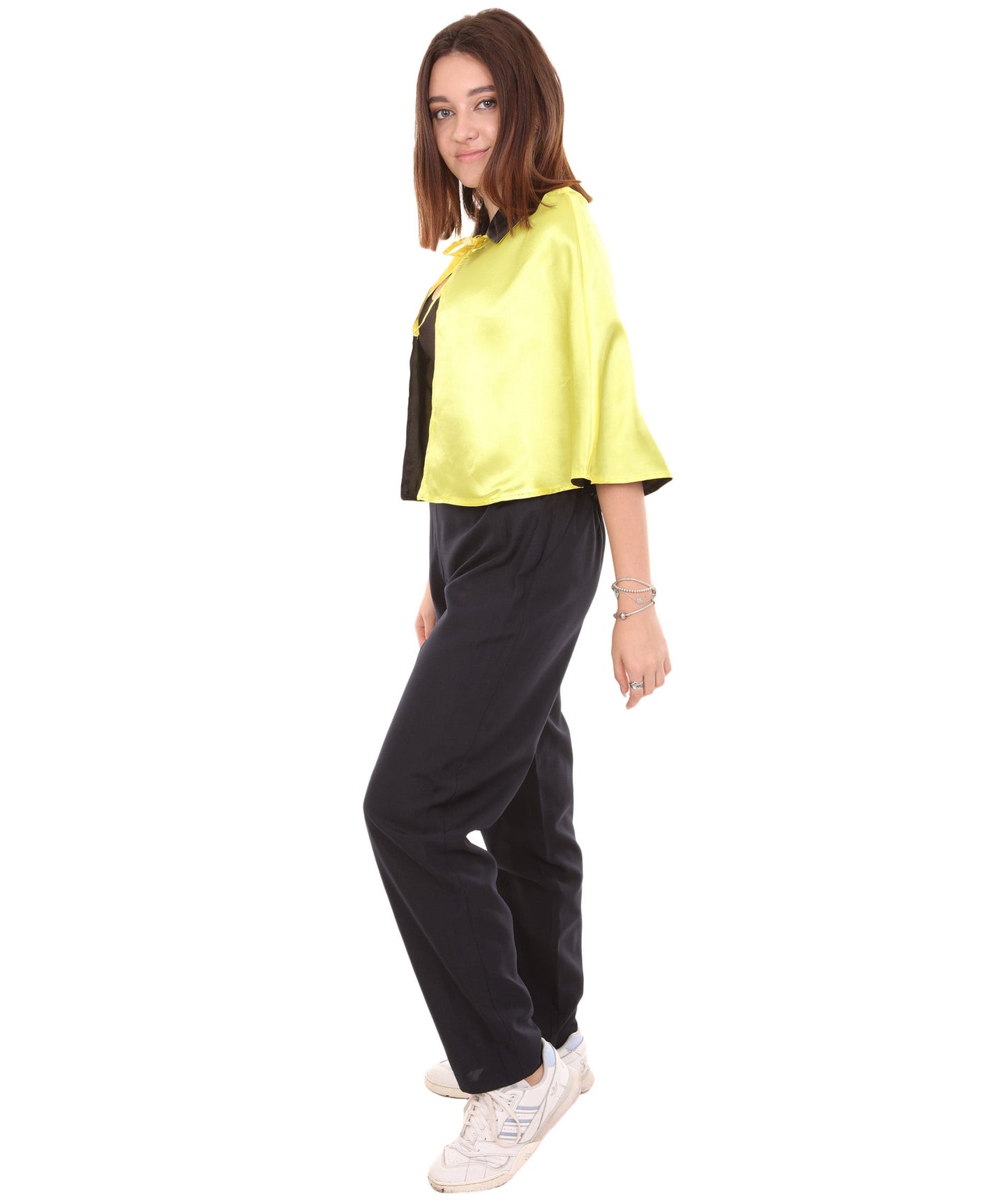 The cape is made of non-flammable synthetic fabric. Also, it is very soft and comfortable to wear. This cosplay accessory creates a regal and commanding silhouette, while the flowing design adds a touch of drama and movement to the overall look.